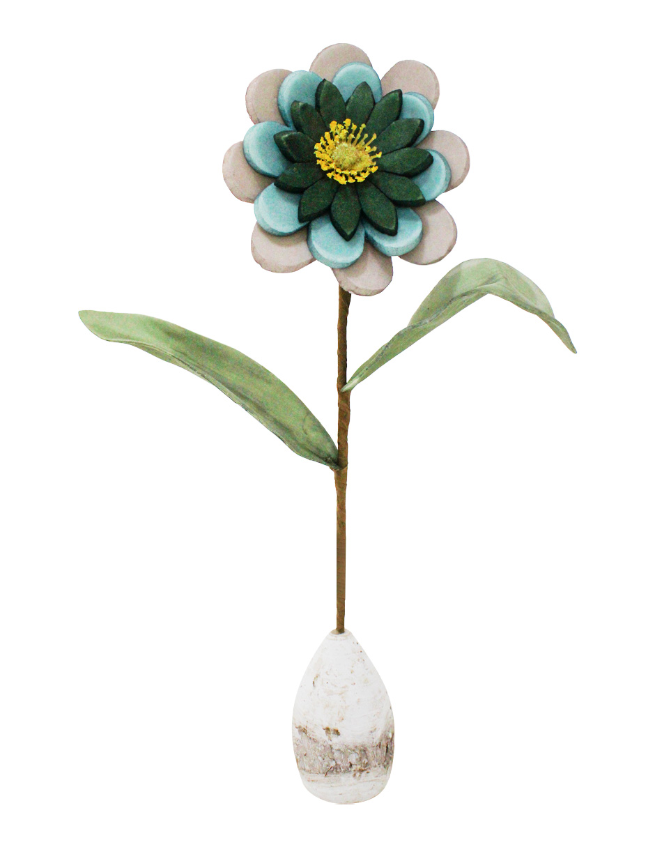 Flor de látex azul con verde y gris en base de madera de 12x12x35cm