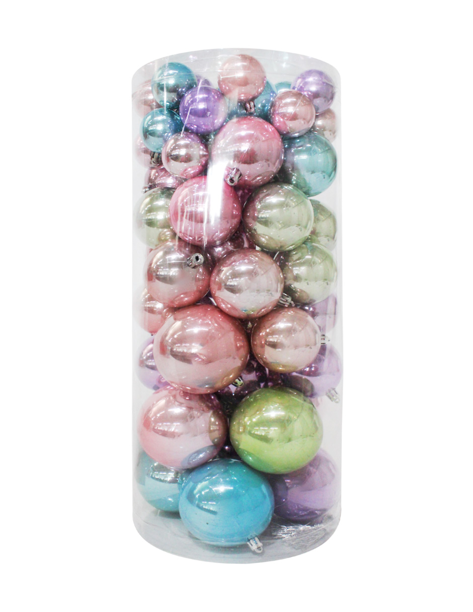Display con 12 esferas de plástico en un diseño tricolor. Ideal para una decoración festiva, colorida y vibrante.