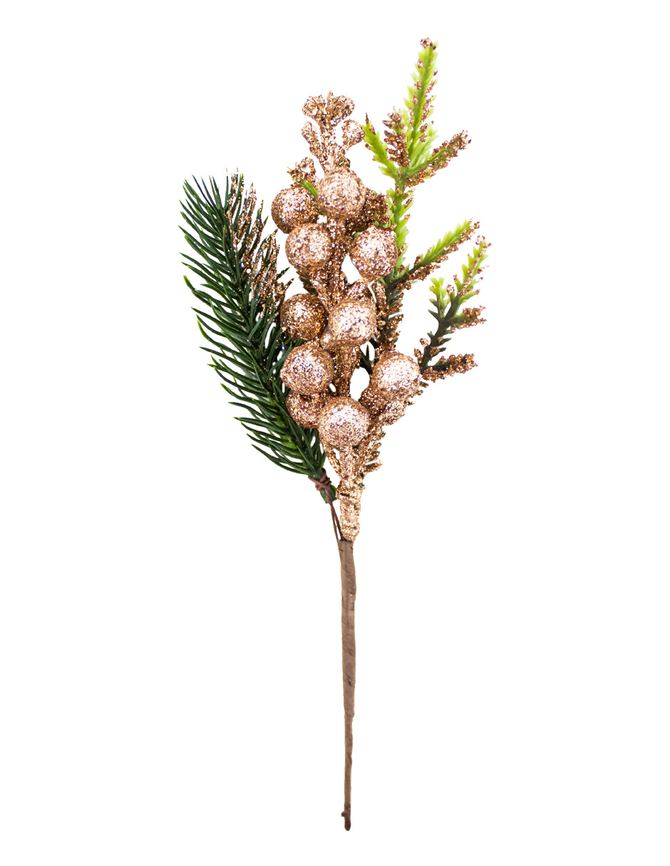 Inyecta la magia invernal y un brillo de lujo a tu decoración con esta elegante vara artificial de bayas. Su acabado glitter en el sofisticado tono champagne crea un efecto visual opulento, moderno y de máxima distinción, ideal para infundir un aire festivo y de glamour sutil. Es el acento perfecto para complementar coronas, jarrones o para crear impresionantes arreglos florales navideños. Material: Plástico con glitter. Medidas: 68 cm de altura.