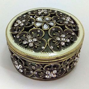 Alhajero de metal dorado redondo con grecas y pedrería de 7.4×7.4×3.7cm