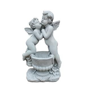 Escultura de ángeles que sostienen un macetero con un acabado de imitación piedra de 72cm. Aporta un toque de paz y elegancia clásica a tu jardín o entrada, combinando arte y funcionalidad.