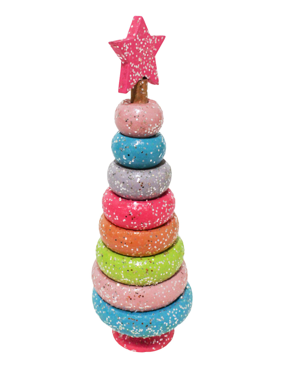 Árbol de metal con un original diseño de aros en colores pastel y una base con estrella rosa. Esta pieza es ideal para quienes buscan una decoración moderna y original que se aleje de lo tradicional. Su vibrante combinación de colores evoca una sensación de alegría y frescura, ideal para crear un ambiente lúdico y festivo. Material: metal. Medidas: 10x10x30.5cm.