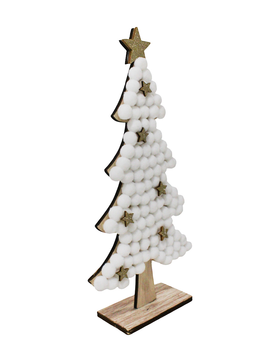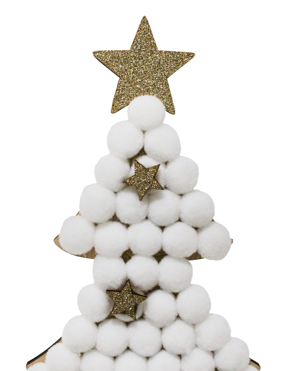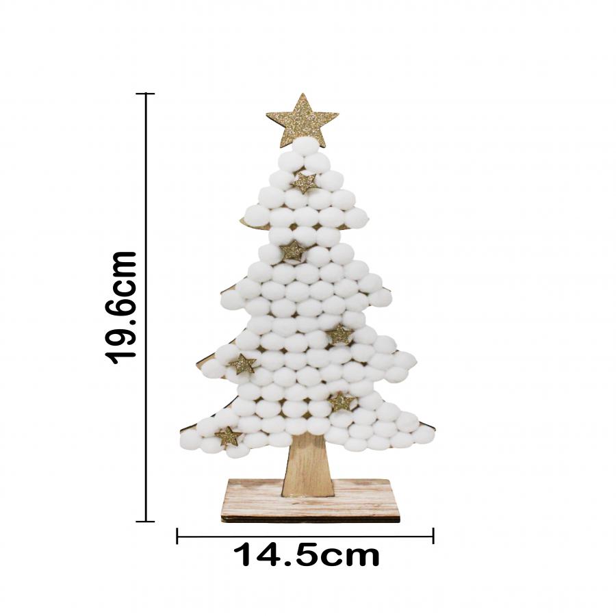 Un elegante árbol de madera con pompones blancos y estrellas doradas, con medidas de 14.5×29.5 cm. Ideal para añadir un toque de pureza y brillo.