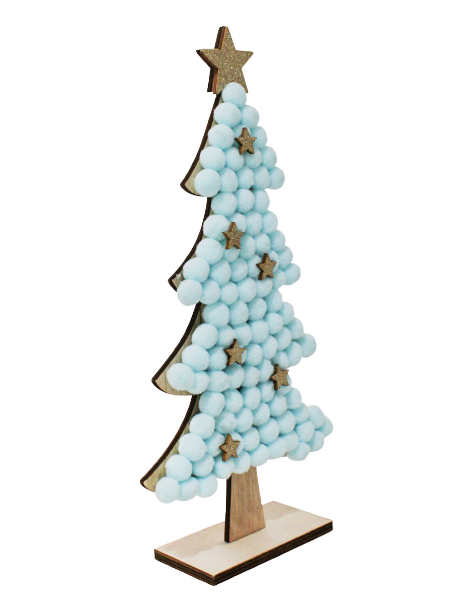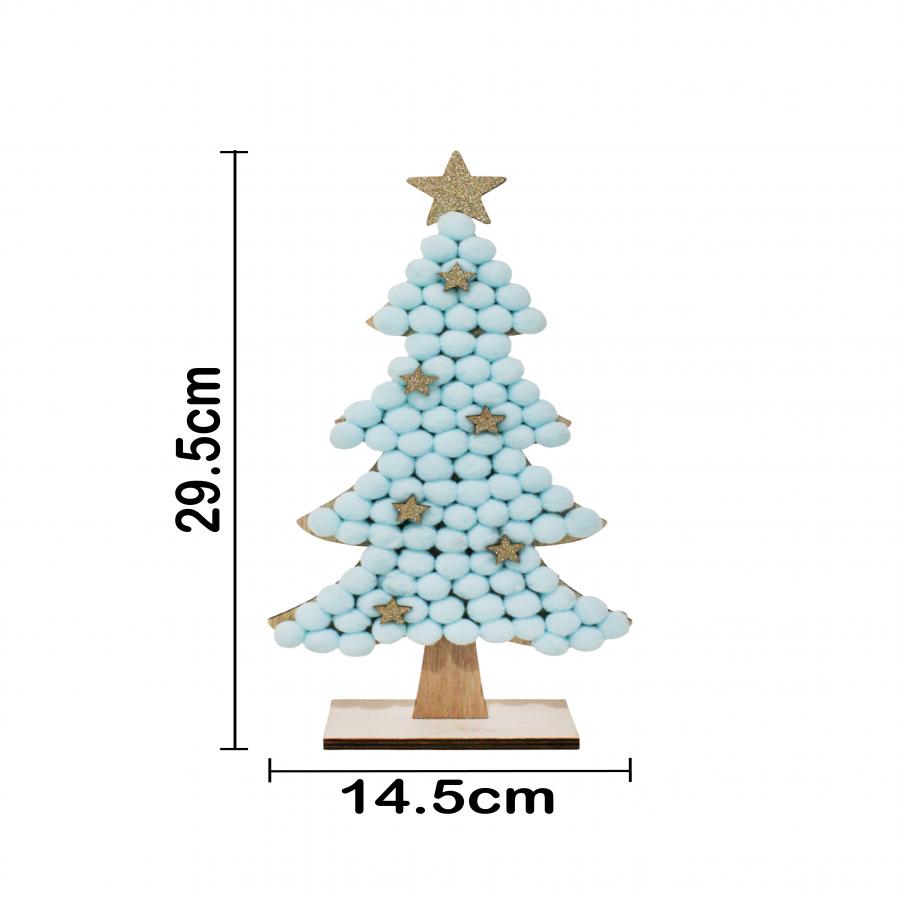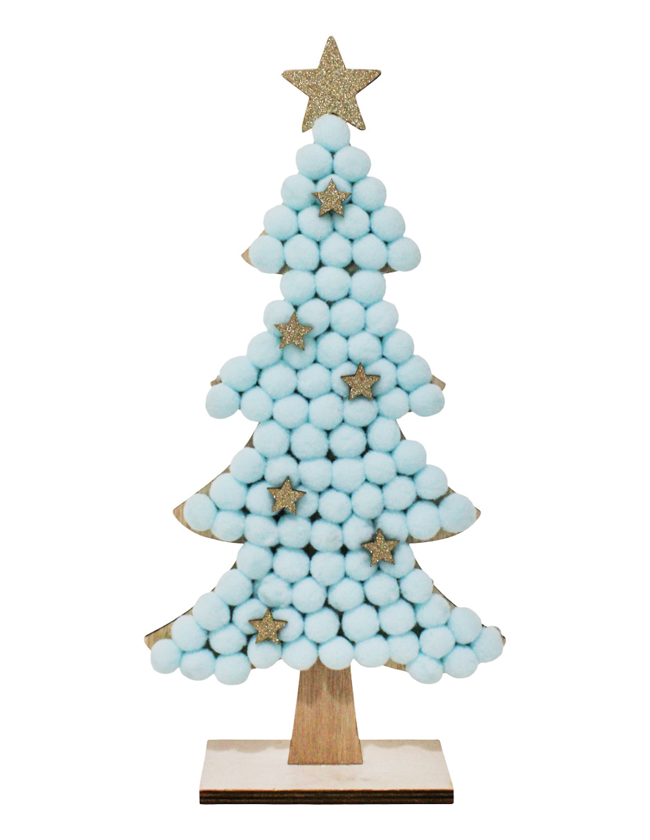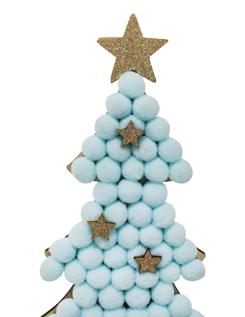 Un elegante árbol de madera con pompones turquesas y estrellas doradas, con medidas de 14.5×29.5 cm. Ideal para añadir un toque de sofisticación y brillo.
