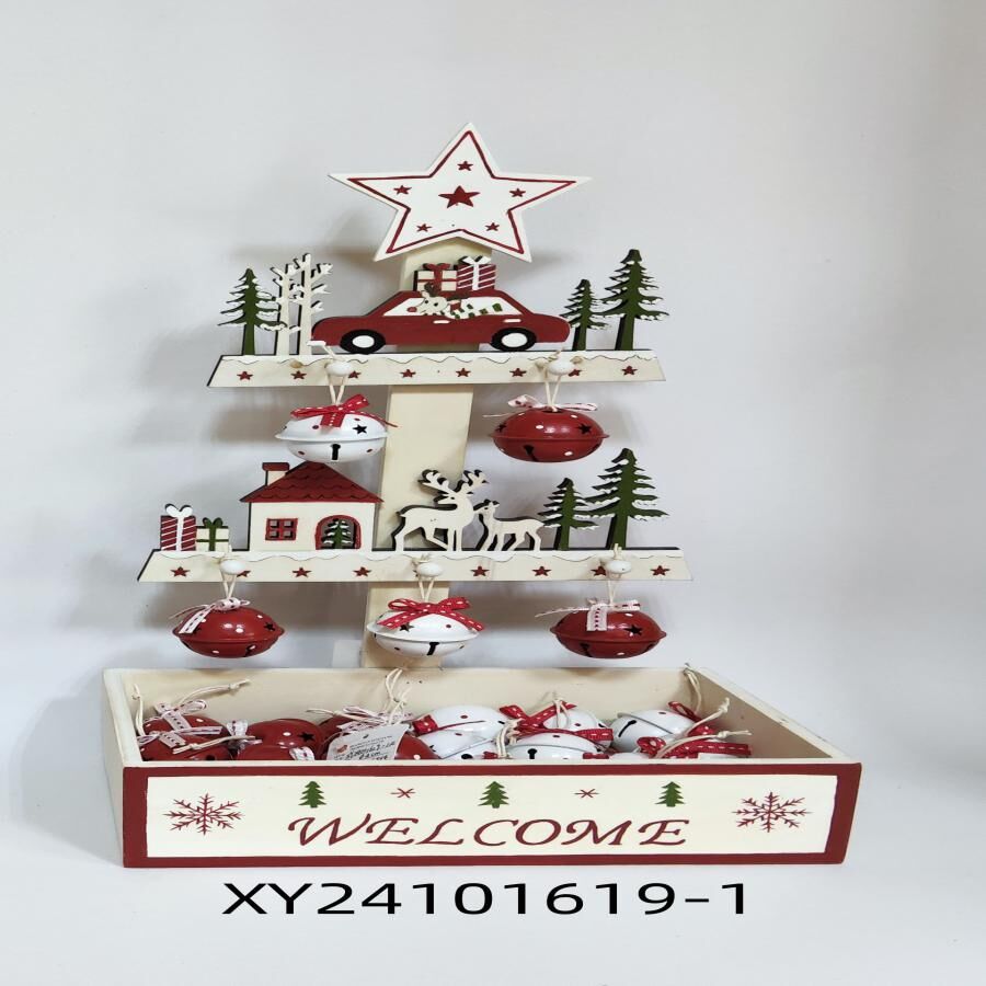 Un festivo árbol de madera con una caja y 24 cascabeles rojos y blancos, con medidas de 14.5×22.5×41.5 cm. Ideal para añadir un toque de tradición y alegría a tu decoración.