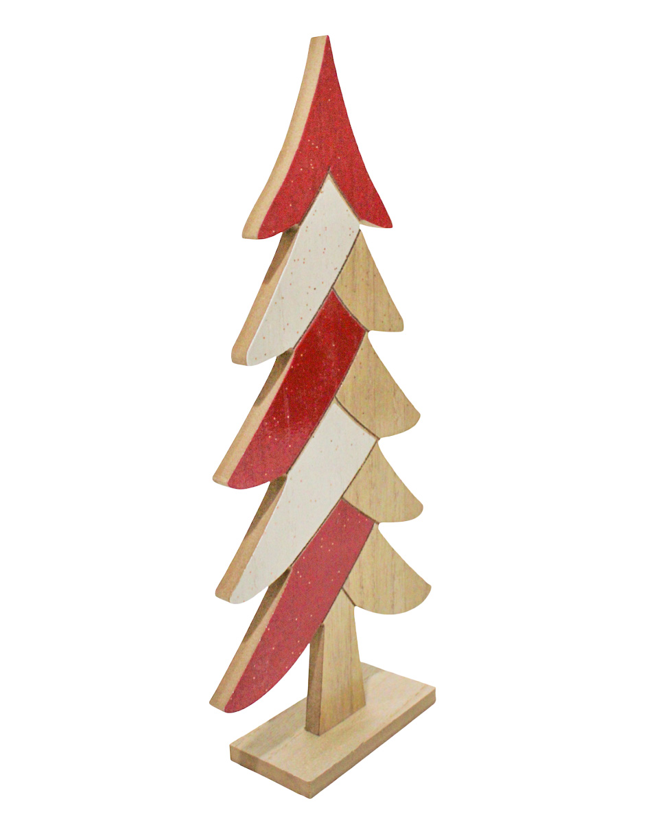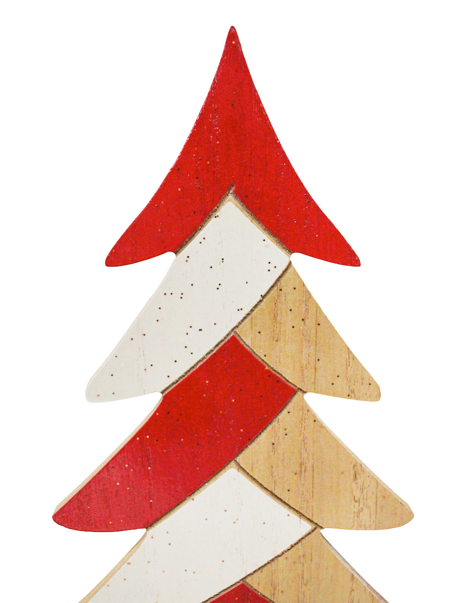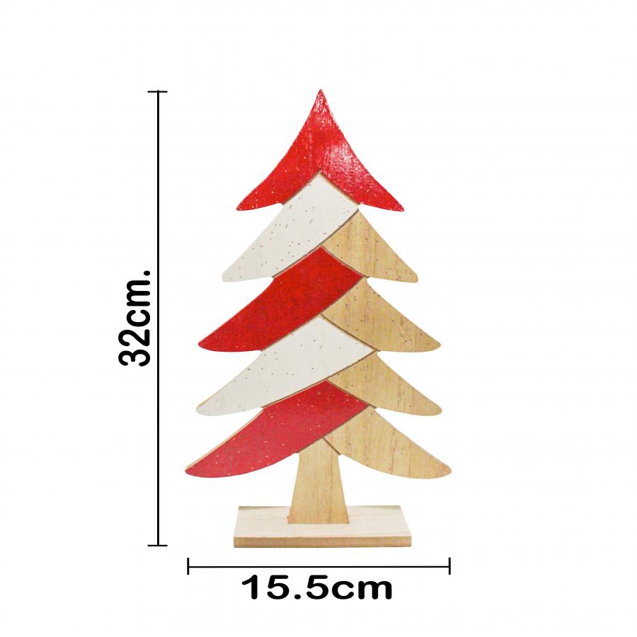 Un festivo árbol de madera en tonos natural, blanca y roja, con medidas de 15.5x32x5 cm. Ideal para un toque de tradición y calidez.