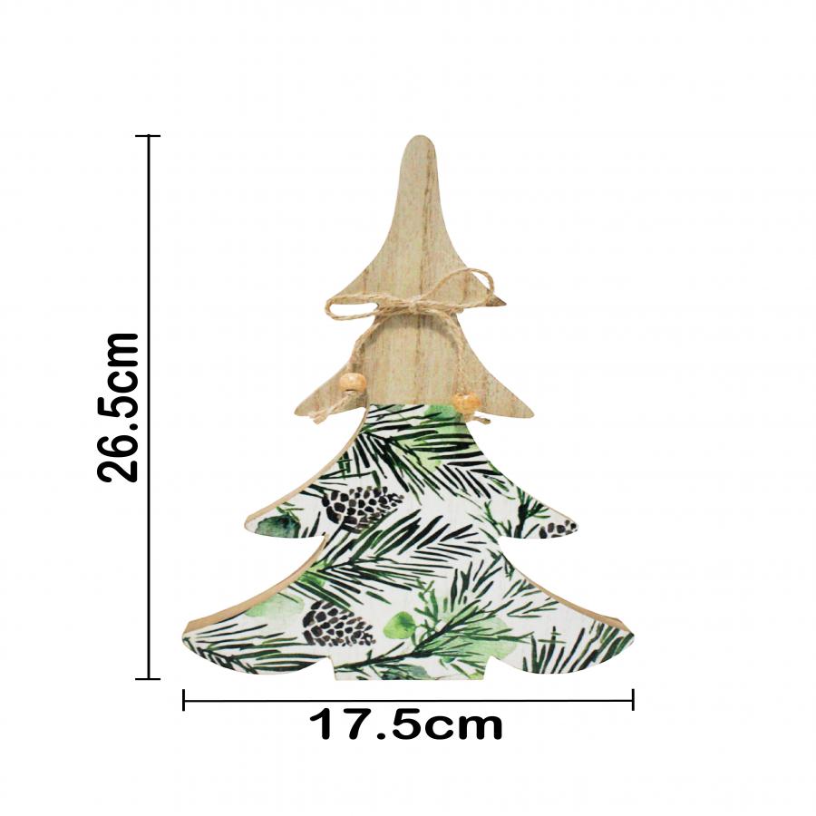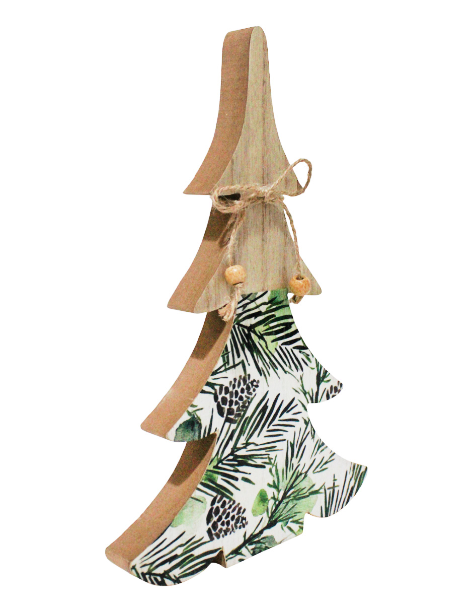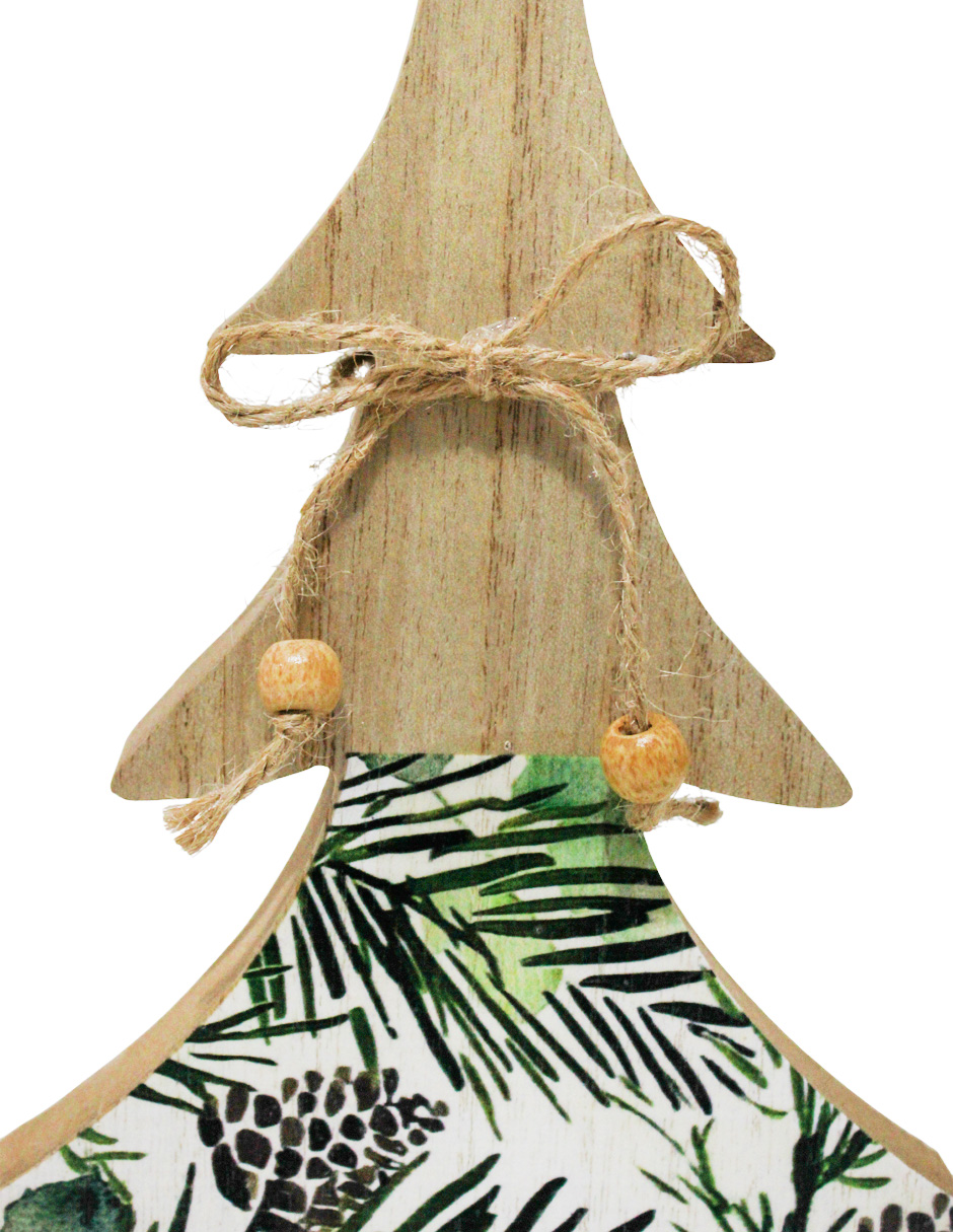 Un rústico árbol de madera natural con un diseño de piñas navideñas, con medidas de 26.5×17.5×2 cm. Ideal para añadir un toque de naturaleza y tradición.