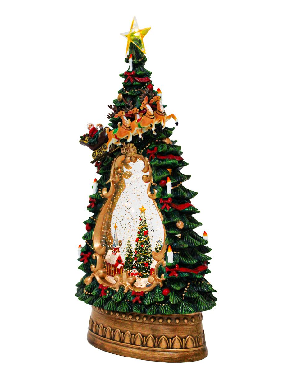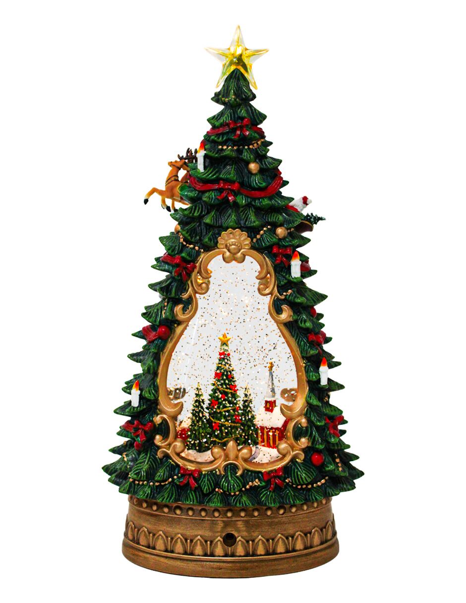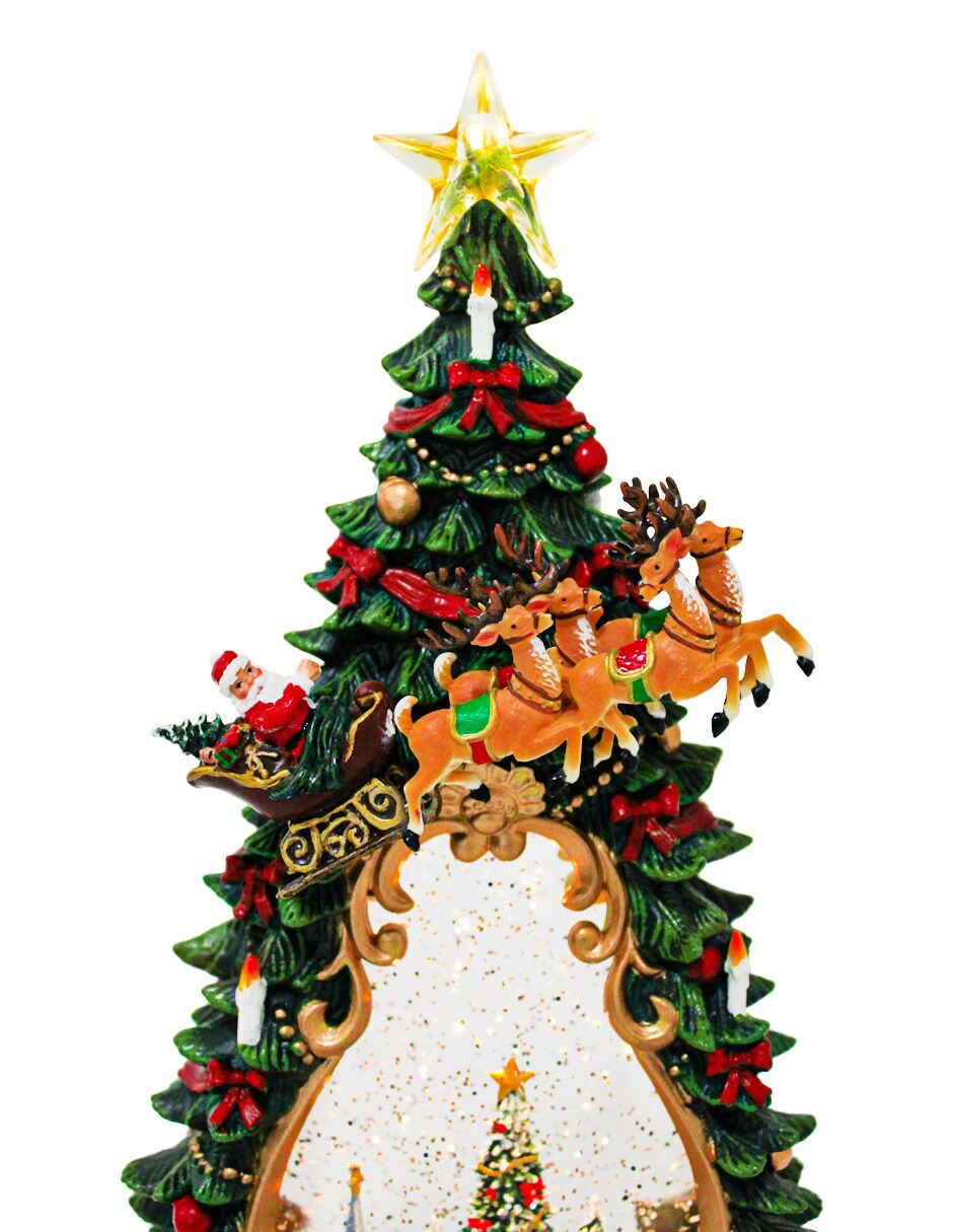 Un hermoso adorno de poliresina que combina un árbol de Navidad con una villa festiva en su interior. Con unas medidas de 17.8×10.2x35cm, esta pieza es musical y se ilumina con luz LED. Incluye un cable USB o puedes usar 3 pilas AA (no incluidas). Es una pieza central que inspira calidez y espíritu navideño.