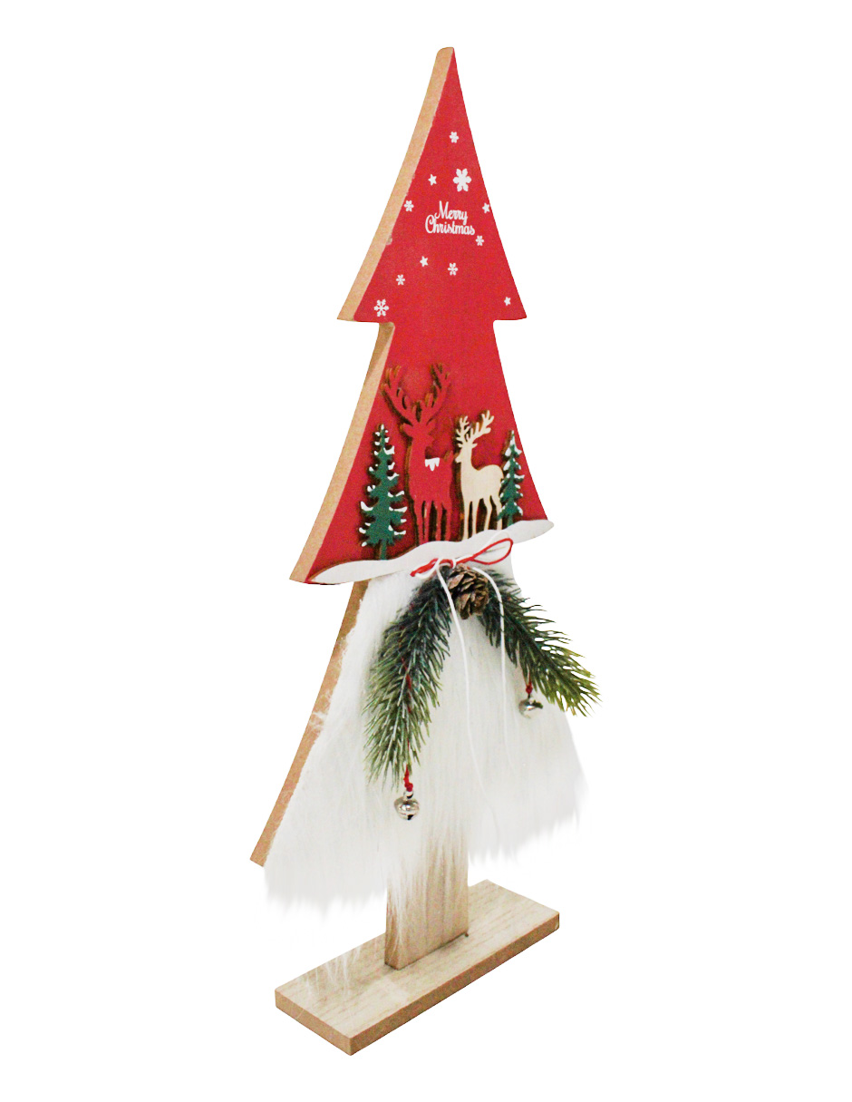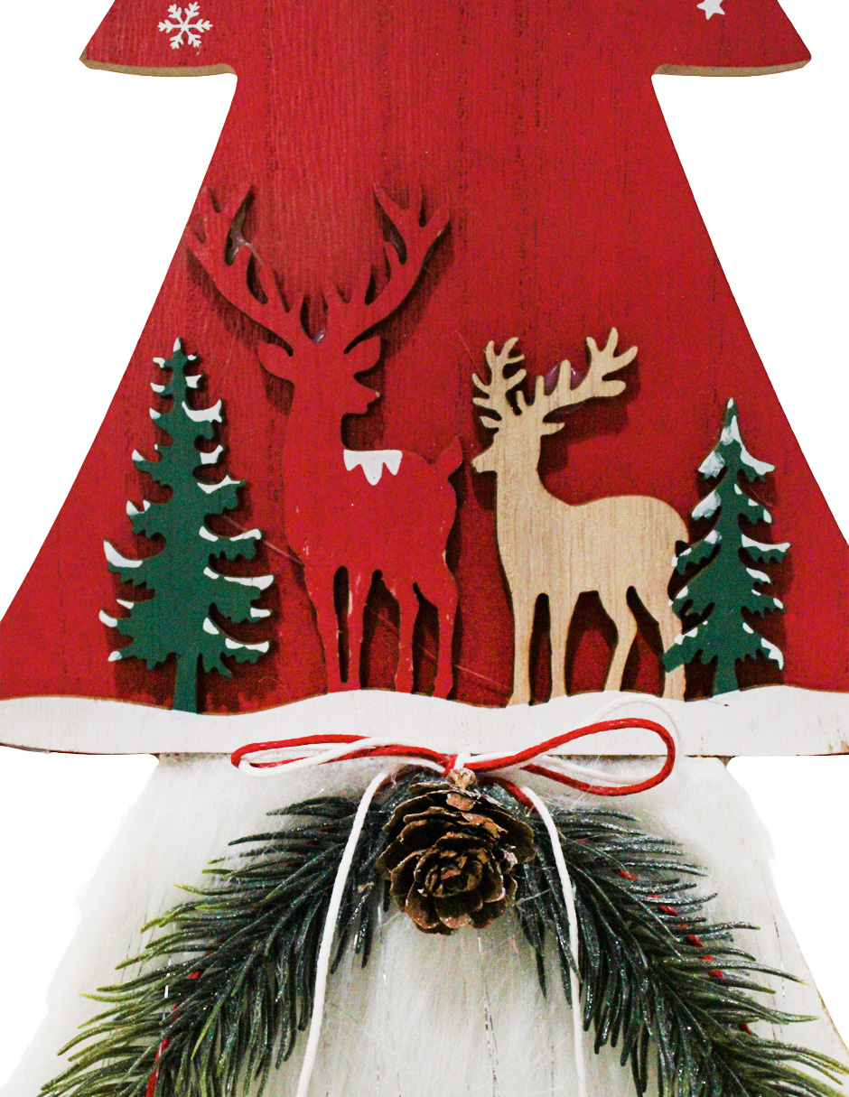 Un festivo árbol de madera roja con peluche, ciervos y pinos navideños, con medidas de 19.5x5x40.5 cm. Ideal para añadir un toque de tradición y calidez.