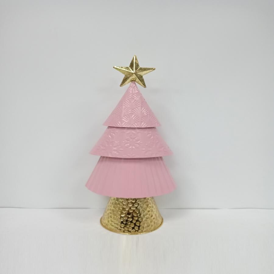 La elegancia de la Navidad en un árbol decorativo. Este árbol rosa con decorado y base martillada dorada es la pieza perfecta para decorar tu hogar en la temporada festiva. Con sus medidas de 14.2x20x47.2cm, su diseño lleno de detalles evoca alegría y calidez.