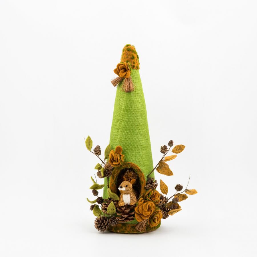 Aporta un toque de alegría a tu espacio exterior con esta ardilla decorativa. Anidada en una base tipo cono verde, te hará sentir la vitalidad y la frescura de la naturaleza en cada rincón. Materiales: fibras plásticas, tela. Medidas: 27x21x55 cm.