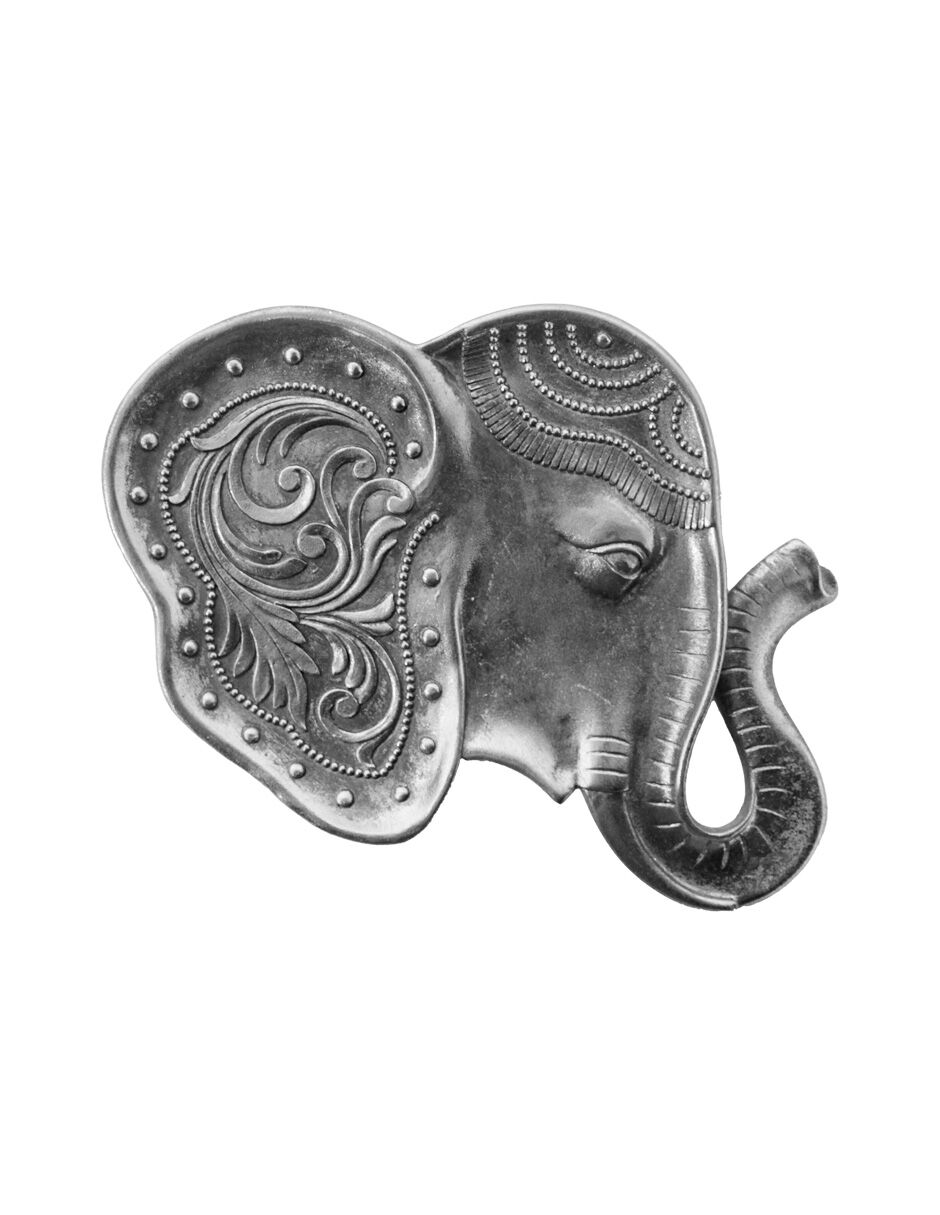 Base de servicio o decoración con diseño de cara de elefante en un acabado plateado. El elefante es símbolo de fortuna y sabiduría. El material es poliresina. Medidas: 22.5 x 16 x 1.2 cm.
