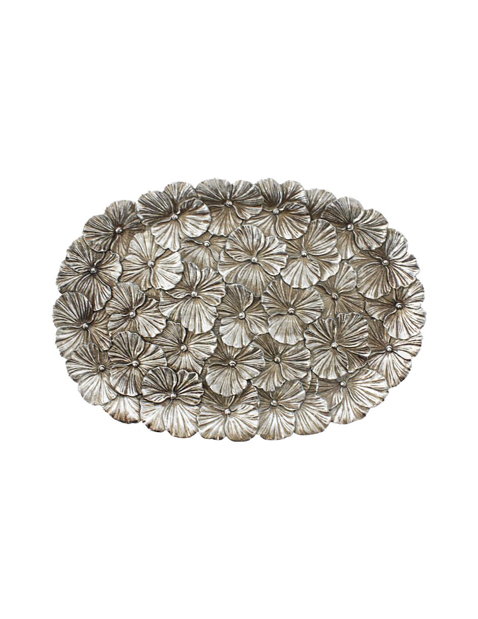 Base de servicio o decoración con diseño de hojas en un acabado plateado. Una pieza orgánica y elegante que evoca la naturaleza. El material es poliresina. Medidas: 29 x 20 x 2 cm.