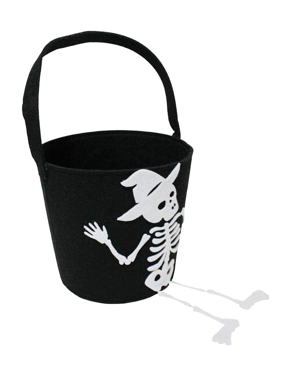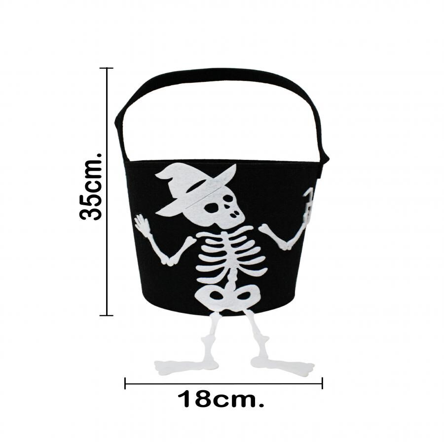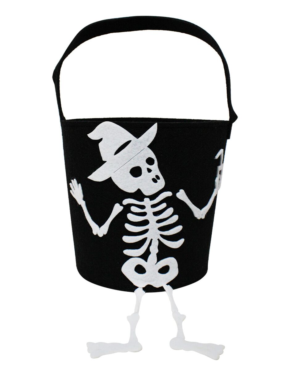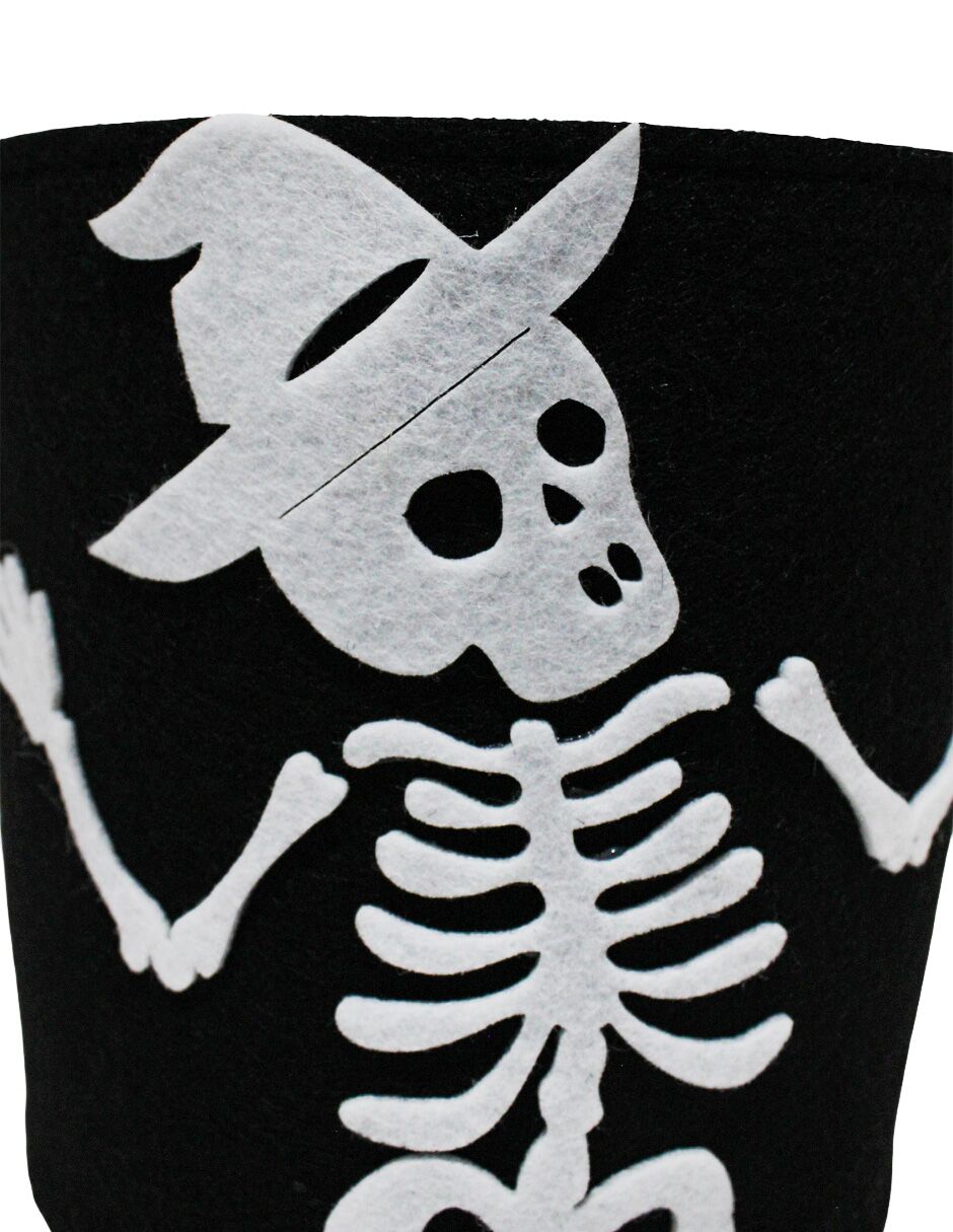 Un toque de misterio y terror para Halloween. Este bote negro con diseño de esqueleto con sombrero es la pieza perfecta para guardar tus dulces en la temporada de terror. Con sus medidas de 18x18x16cm, su diseño lleno de detalles evoca el misterio y la diversión.
