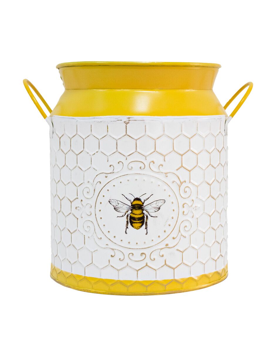 Bote de almacenamiento con tapa y un divertido diseño de abeja en colores blanco y amarillo. Ideal para guardar pequeños juguetes, dulces o como pieza decorativa lúdica. El material es metal. Medidas: 20.5 x 16 x 19 cm.