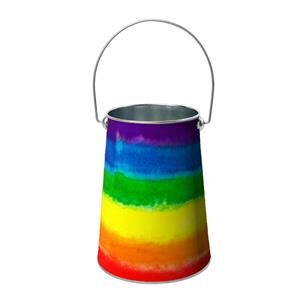Bote de almacenamiento con práctica agarradera y un alegre diseño de arcoíris. Aporta un toque divertido y vibrante, ideal para guardar juguetes o manualidades. El material es metal. Medidas: 13 x 17 x 26 cm.