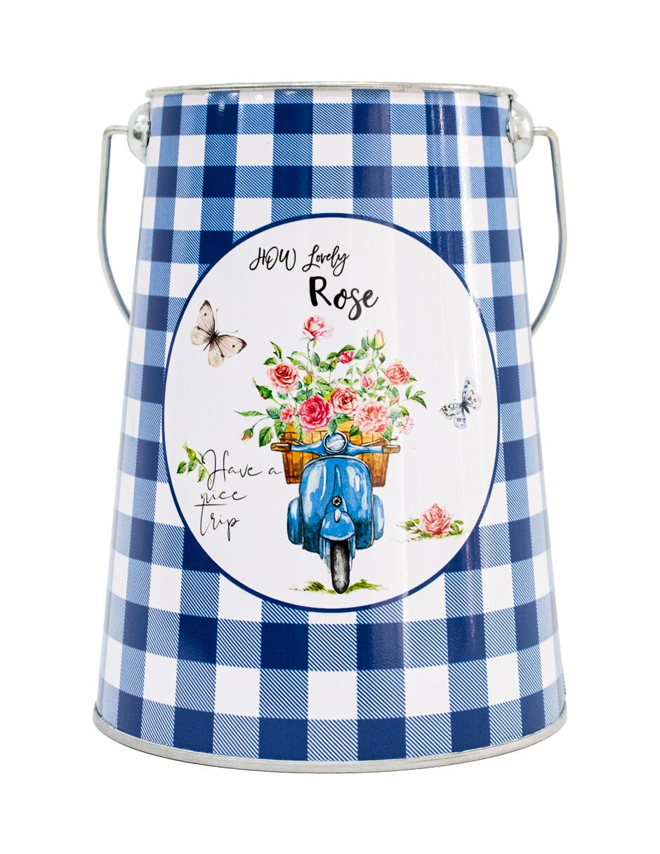 Bote con agarradera con un fresco diseño de cuadros azules y blancos, con flores y mariposas. Aporta un toque de paz y naturaleza a la decoración. El material es metal. Medidas: 13 x 26 x 10 cm.