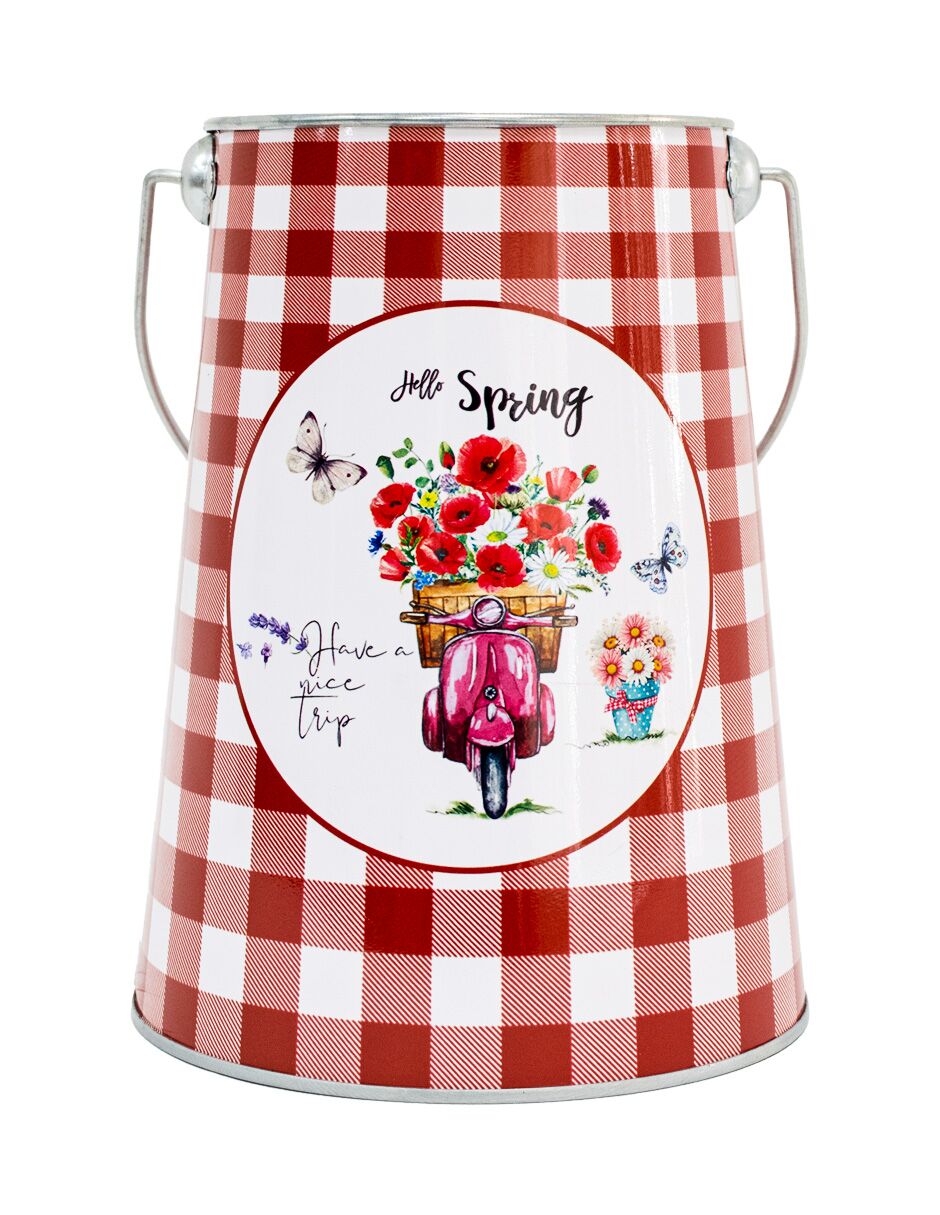 Bote con agarradera con un cálido diseño de cuadros rojos y blancos, con flores y mariposas. Su estilo clásico de granja añade calidez a cualquier espacio. El material es metal. Medidas: 13 x 26 x 10 cm.