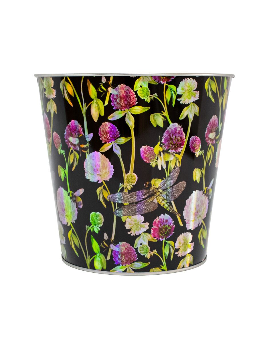 Bote de almacenamiento con un elegante diseño de flores blancas y moradas sobre un fondo neutro. Su estilo es sofisticado y es perfecto para guardar suministros de costura o accesorios. El material es metal. Medidas: 17.5 x 16.5 x 13.5 cm.