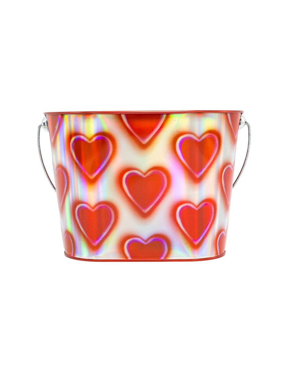 Bote de forma ovalada y gran capacidad. Incluye una agarradera metálica para un manejo sencillo. Decorado con un llamativo diseño de corazones rojos por toda la superficie. El material es metal. Medidas: 20 x 13 x 26.5 cm.