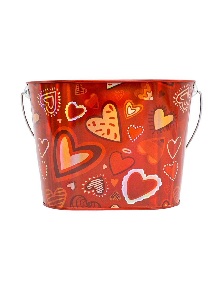 Bote de forma ovalada con una robusta agarradera metálica. Su diseño con corazones rojos lo hace ideal como macetero, florero o contenedor decorativo. El material es metal. Medidas: 20 x 13 x 26.5 cm.