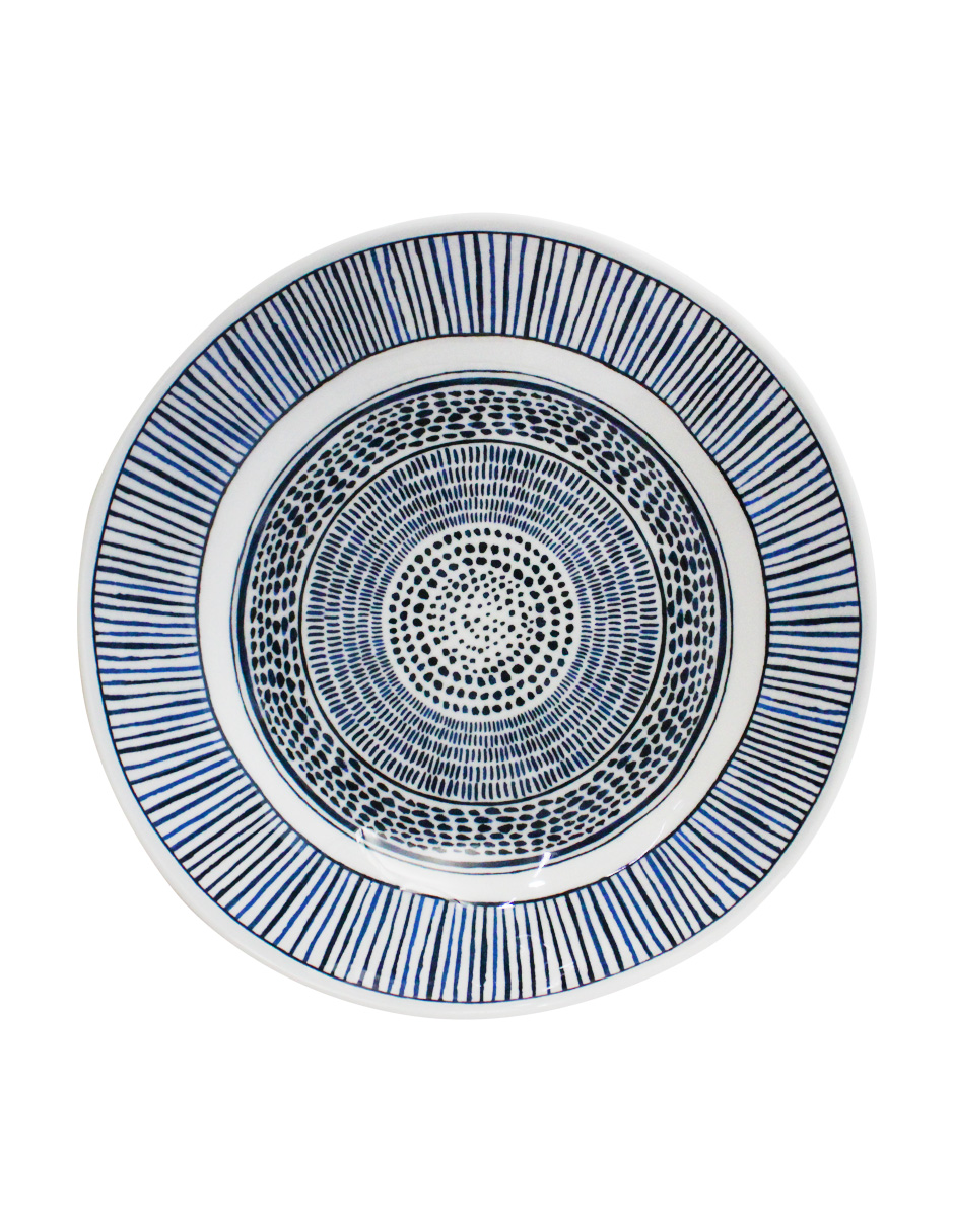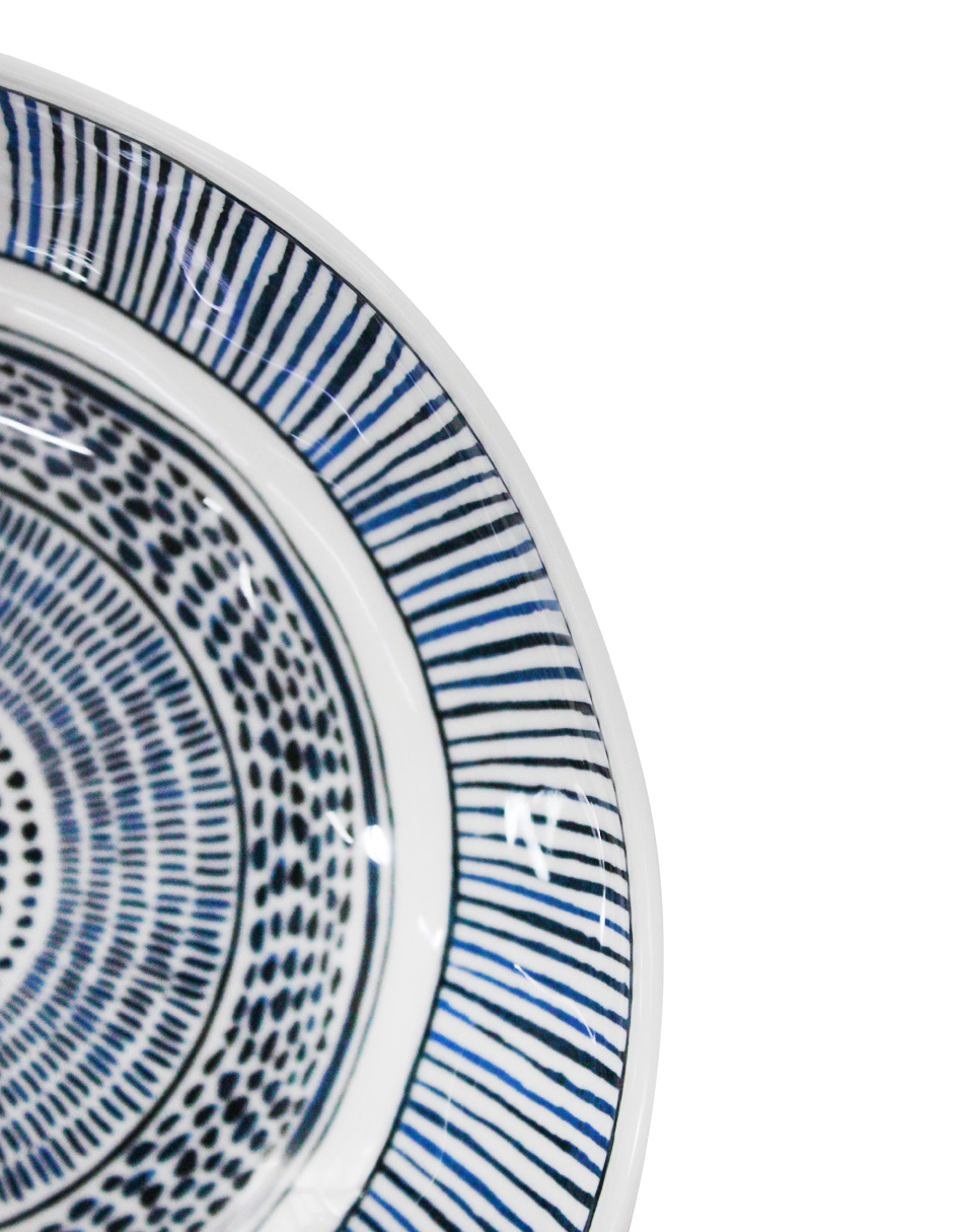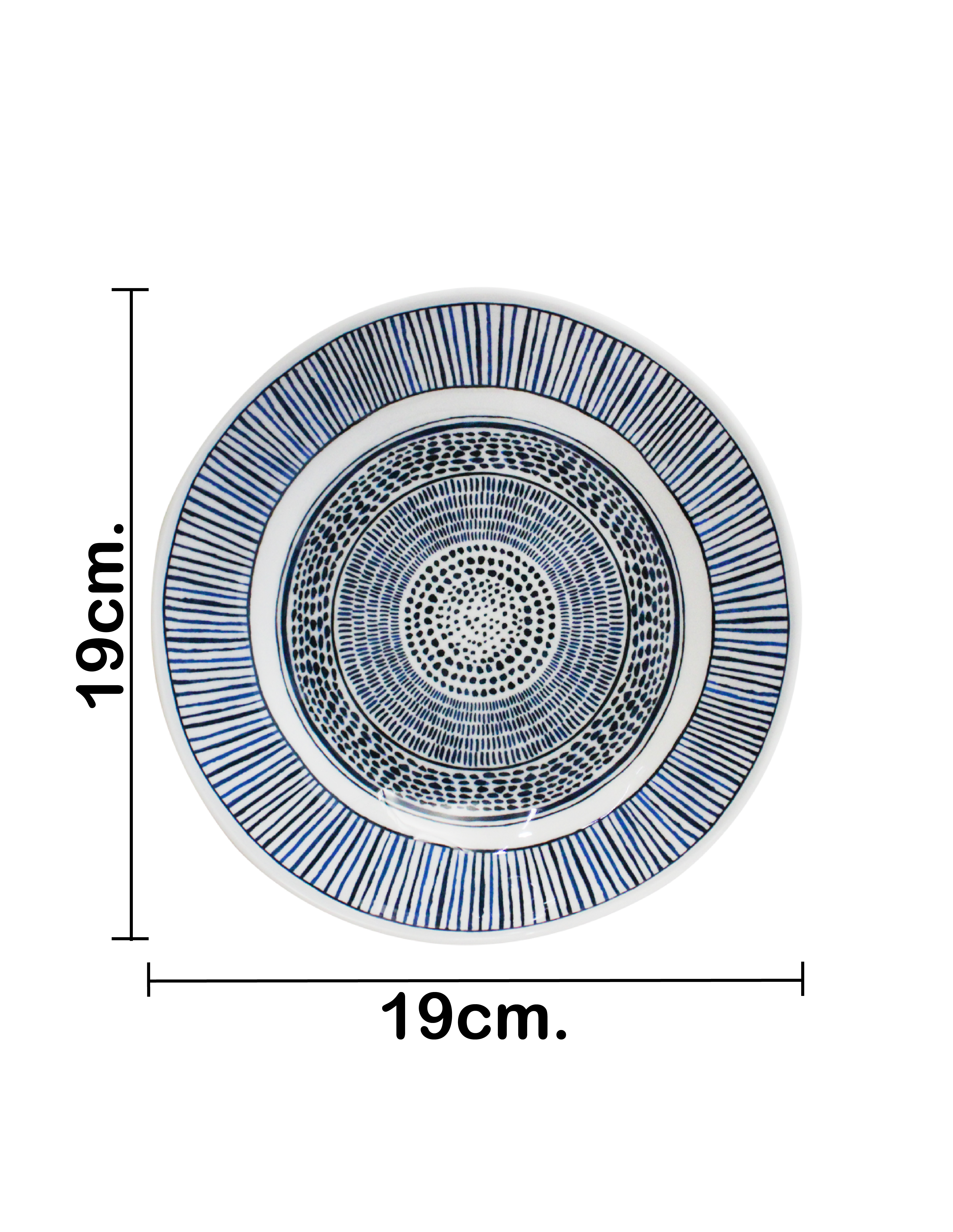 Bowl de melamina azul con un patrón de puntos decorativos. Un diseño clásico y versátil. El material es melamina. Medidas: 19 x 19 x 5 cm.