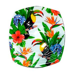 Bowl fabricado en cristal con un vibrante diseño de flores tropicales y tucanes. Aporta un toque exótico y alegre a tu mesa. El material es cristal. Medidas: 18 x 18 x 5 cm.