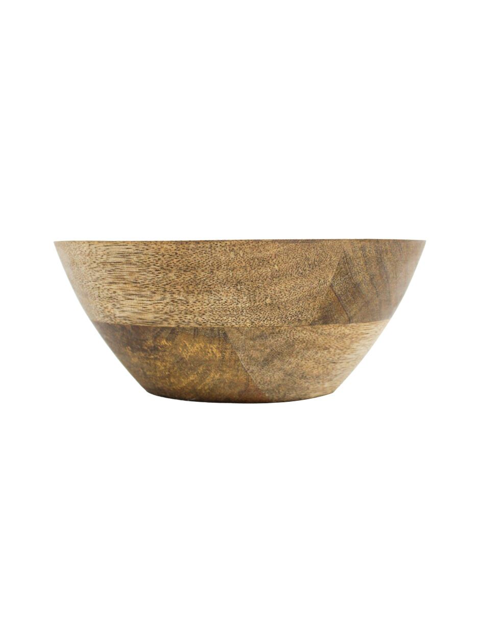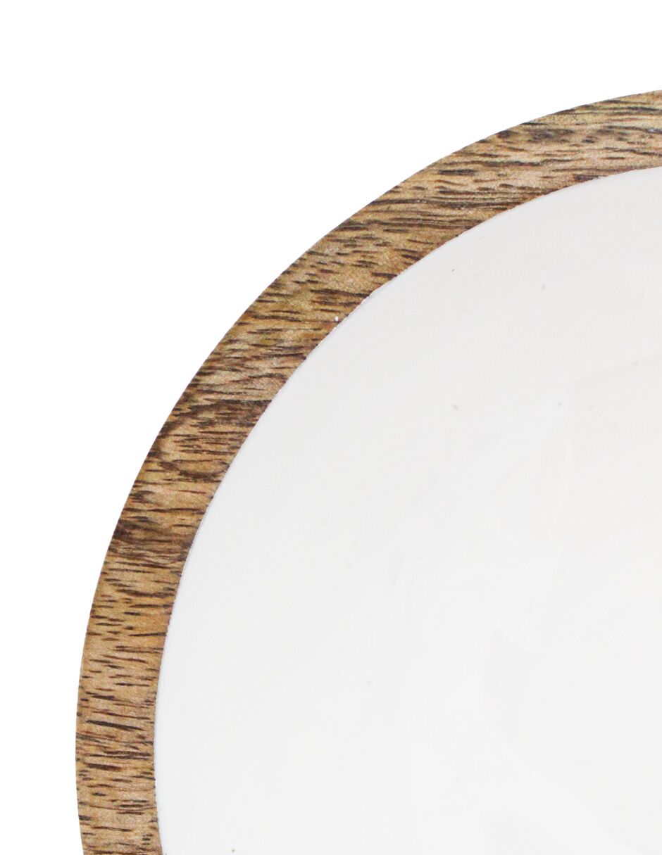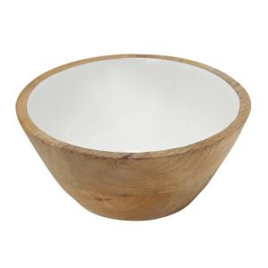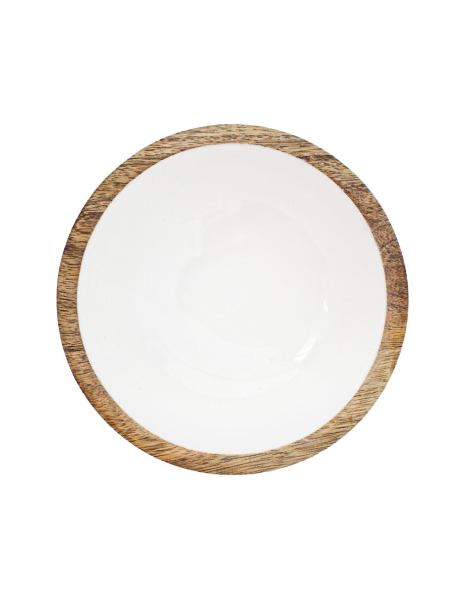 Bowl chico para servir aperitivos o dips, con cuerpo de madera y borde de metal pintado de blanco. El material es madera y metal. Medidas: 15.5 x 15.5 x 7 cm.