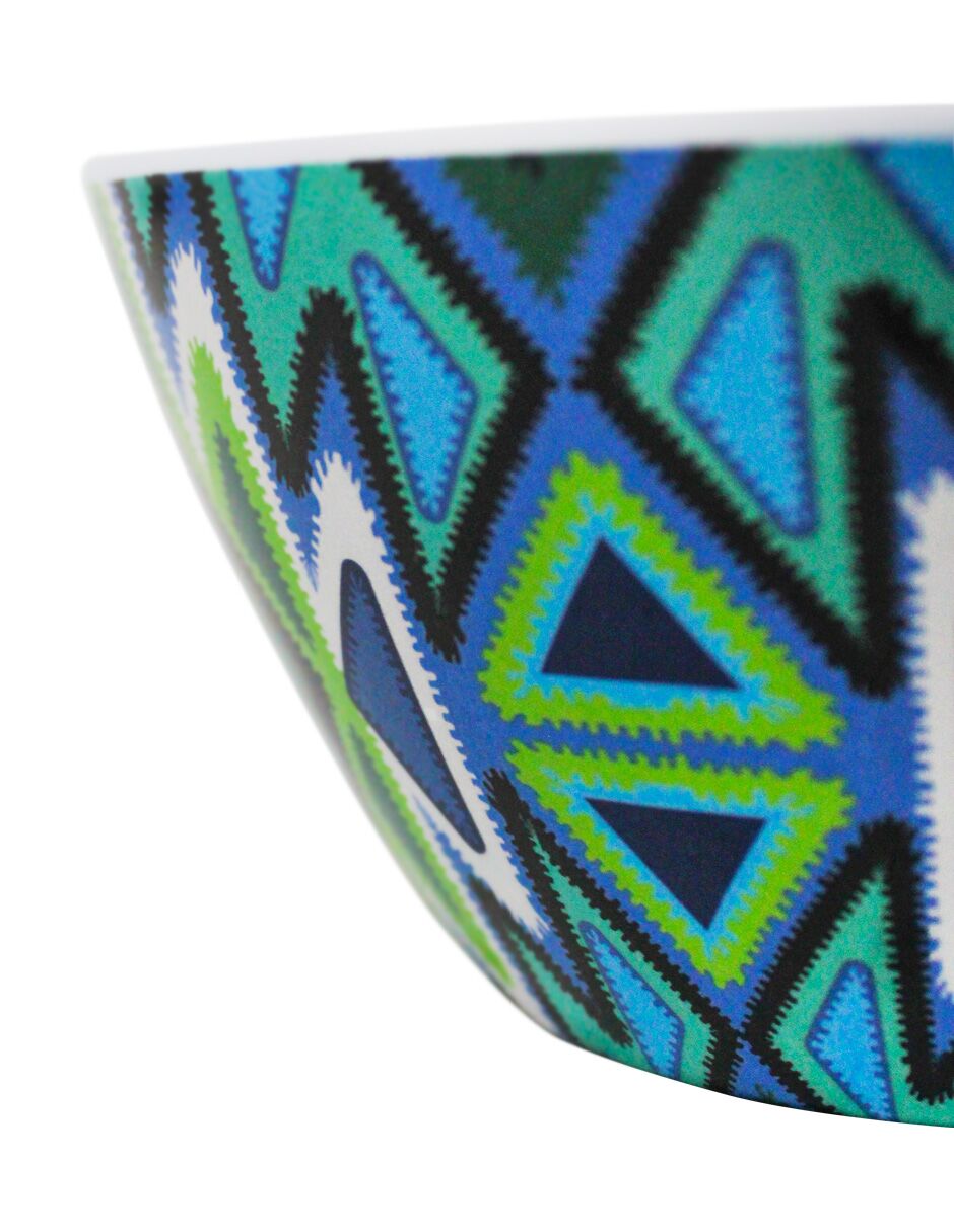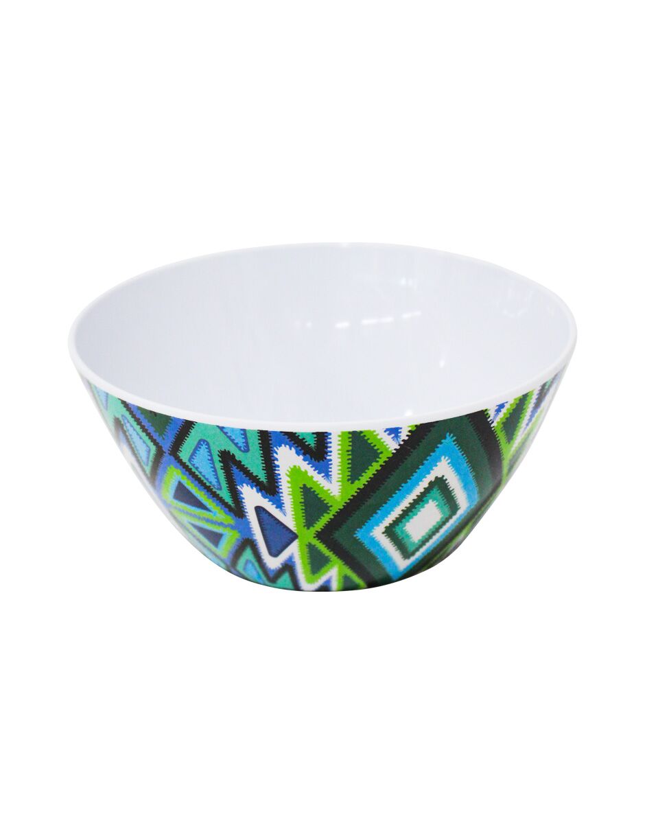 Bowl fabricado en melamina con un vibrante diseño étnico en tonos verde. Aporta un look natural y colorido a la mesa. El material es melamina. Medidas: 15.7 x 15.7 x 7.3 cm.