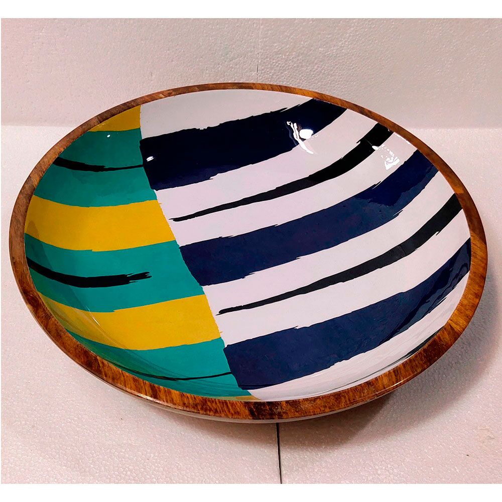 Bowl grande y decorativo con un fresco estampado de rayas azules y verdes. Perfecto para servir ensaladas en verano o como centro de mesa con un look playero. El material es madera. Medidas: 37.5 x 37.5 x 8 cm.