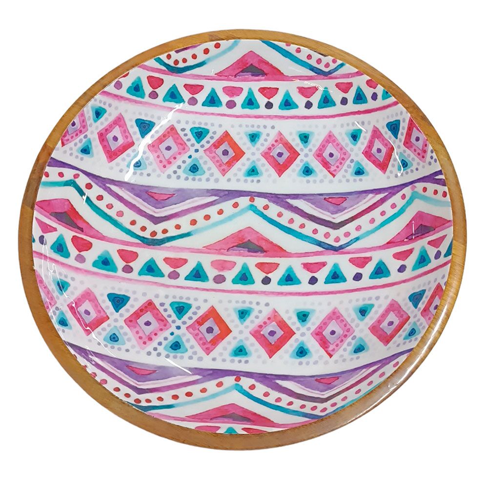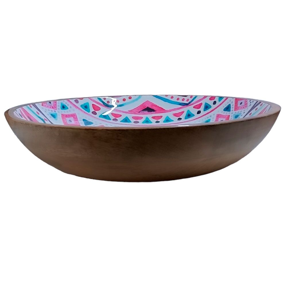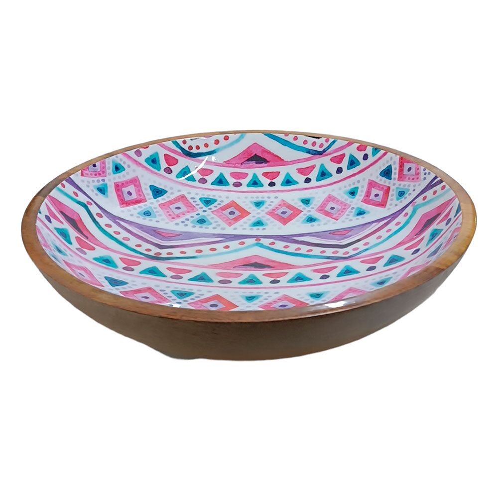 Bowl grande y decorativo con un vibrante estampado de rombos y líneas en colores rosa y morado. Perfecto como centro de mesa o para servir ensaladas con un toque bohemio. El material es madera. Medidas: 38 x 8 cm.