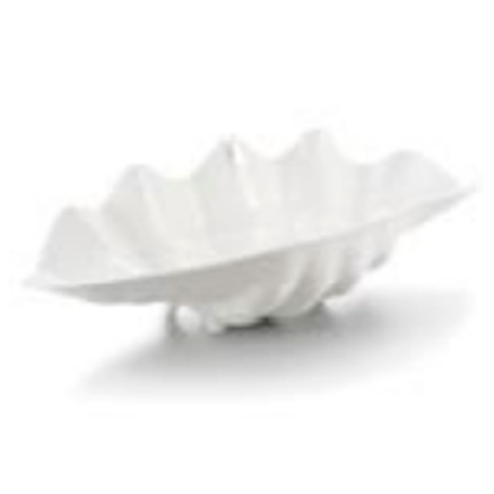 Bowl extra grande de melamina blanca con un elegante diseño de concha y una reja (rejilla) para escurrir. Ideal para servir ensaladas, frutas o mariscos en grandes reuniones o buffets. El material es melamina. Medidas: 54.7 x 27.9 x 17.1 cm.