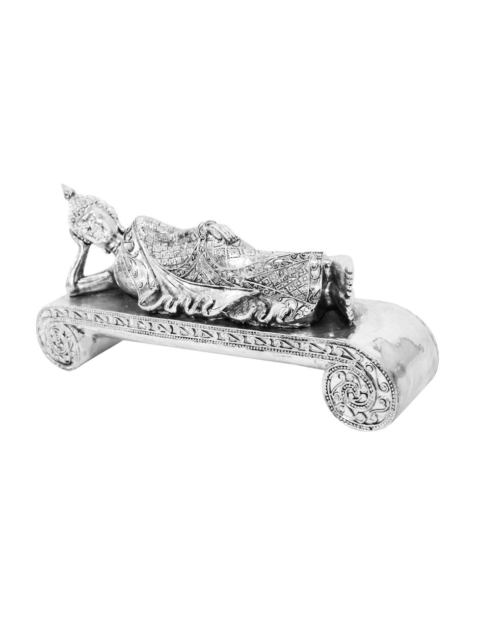Inyecta paz profunda, serenidad y una distinción sublime a tu espacio con esta hermosa Buda Recostado Plateado de Poliresina. Esta pieza de arte no es solo un objeto decorativo; es una representación de la paz interior, la meditación y el logro de la iluminación, aportando un ambiente de armonía, enfoque y bienestar. La serena pose recostada, con un elegante acabado en plateado, es un símbolo de la liberación y la calma absoluta.
