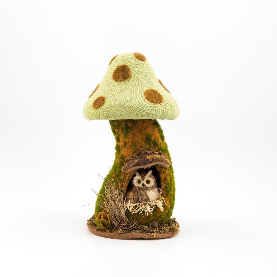 Aporta un toque de encanto a tu jardín con este búho decorativo anidado en una base tipo seta. Un diseño mágico que te hará sentir la conexión con la naturaleza. Materiales: fibras plásticas, tela. Medidas: 22x19x37 cm.