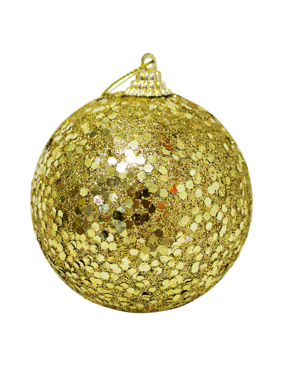Caja con 4 esferas con lentejuela dorada. Son perfectas para añadir un toque de brillo y glamour a tu árbol de Navidad, llenándolo de luz. Miden 8cm.
