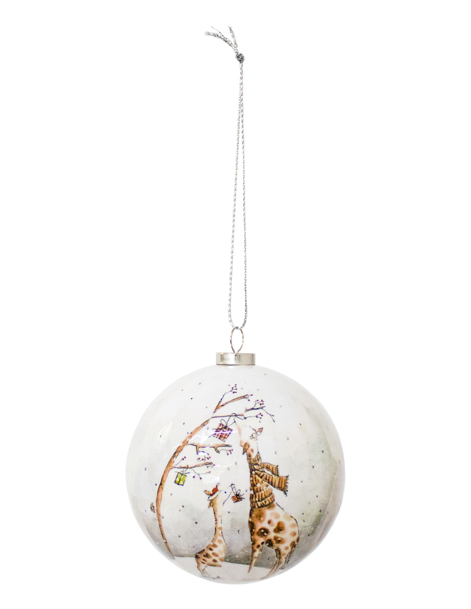 Caja con 4 esferas de plástico con un original diseño de jirafas y velas. Sus medidas son 8 x 8 x 8 cm. Ideal para una decoración novedosa y temática.