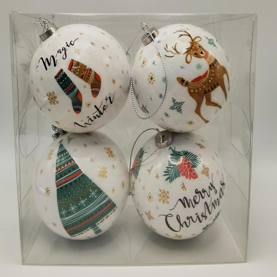 Caja con 4 esferas de plástico con diseño navideño tradicional. Sus medidas son 8 x 8 x 8 cm. Ideal para una decoración clásica y festiva.