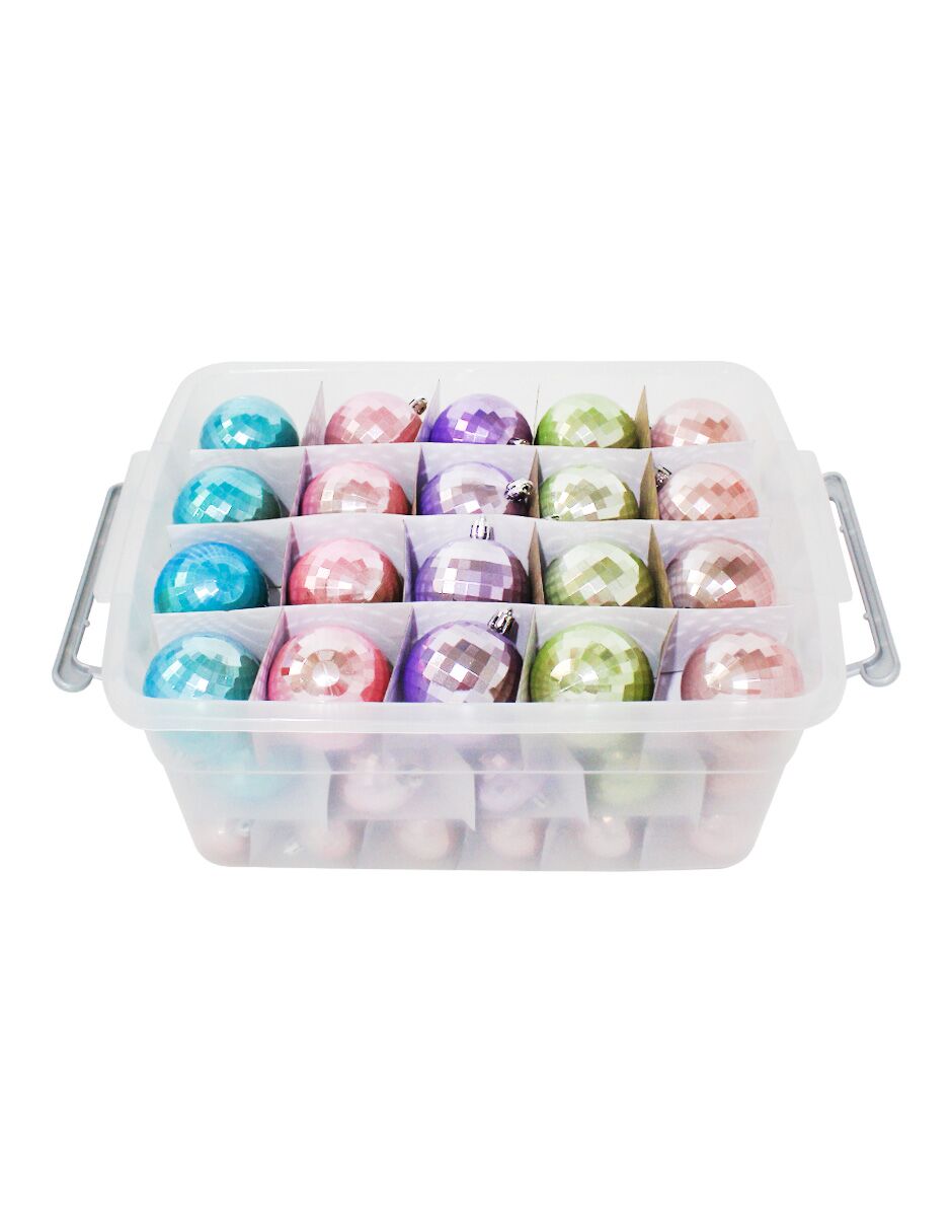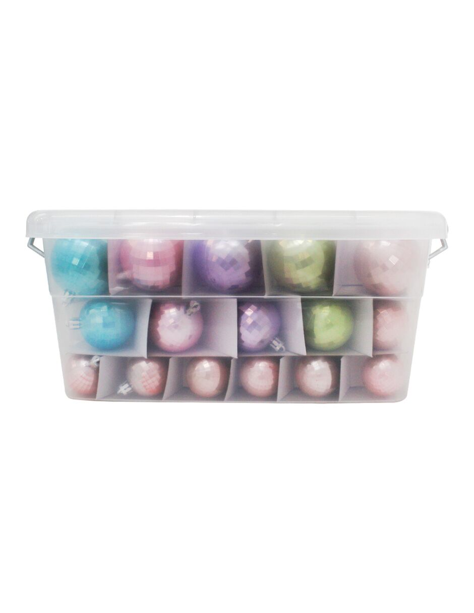 Caja de esferas de plástico con apariencia de cristal en tonos pastel. Ideal para una decoración moderna, luminosa y sutil.