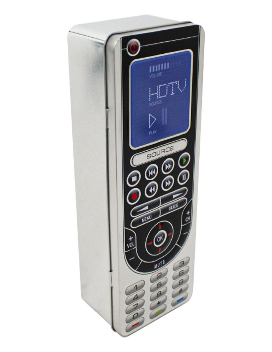 Guarda tus objetos con un toque divertido. Esta caja de lámina plateada con diseño de control remoto es perfecta para guardar tus controles y baterías, añadiendo un acento único. Su diseño te hará sentir la comodidad y la diversión. Mide 29.5x10x6.8cm.