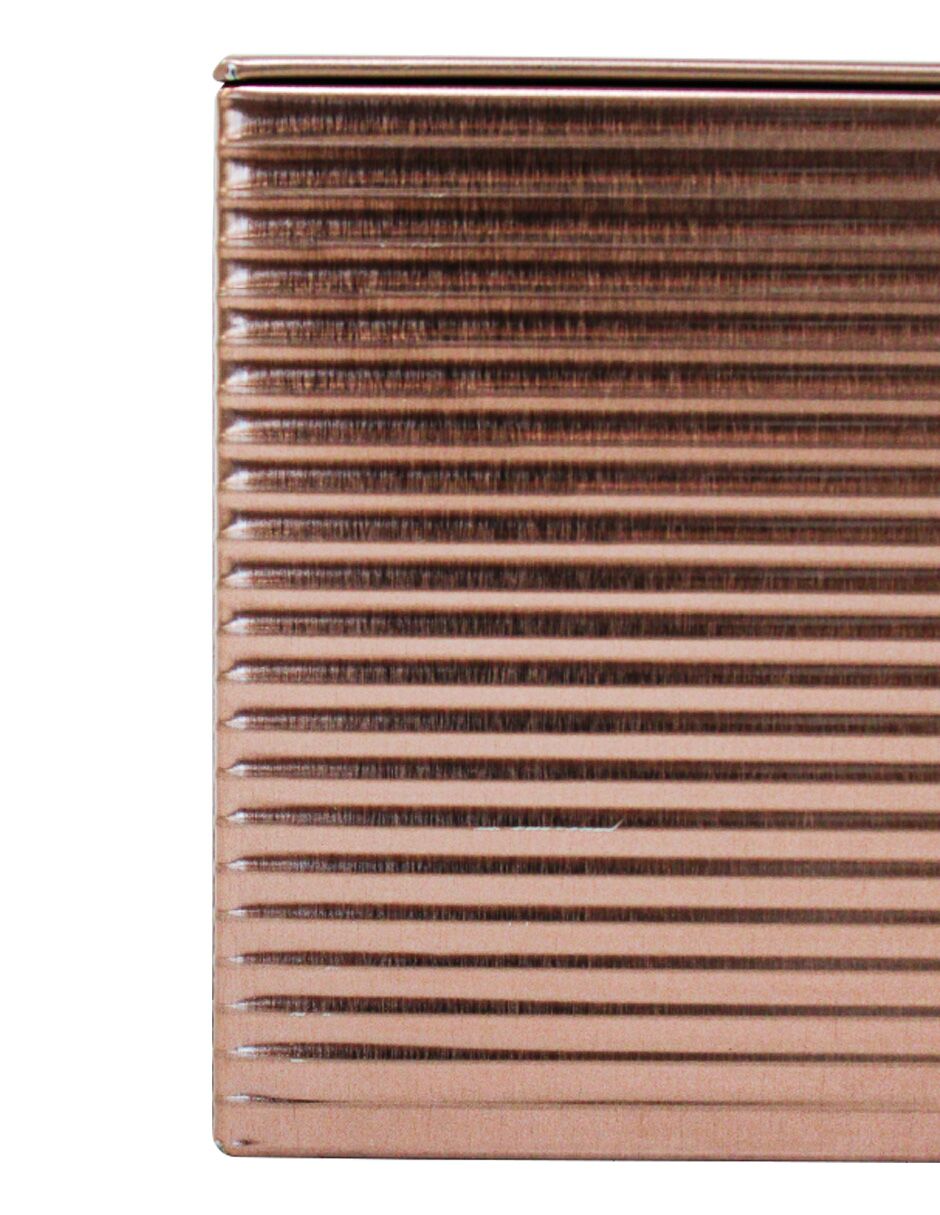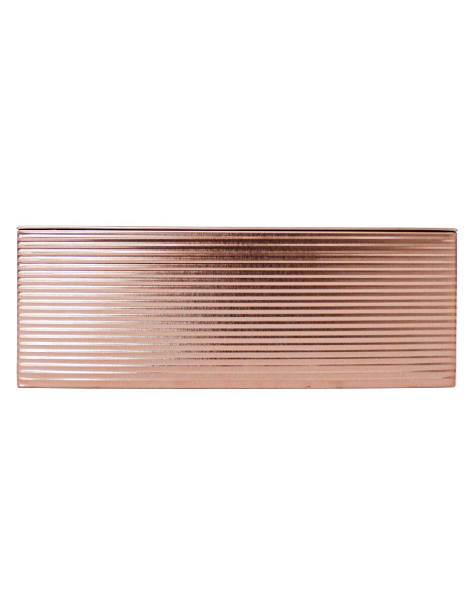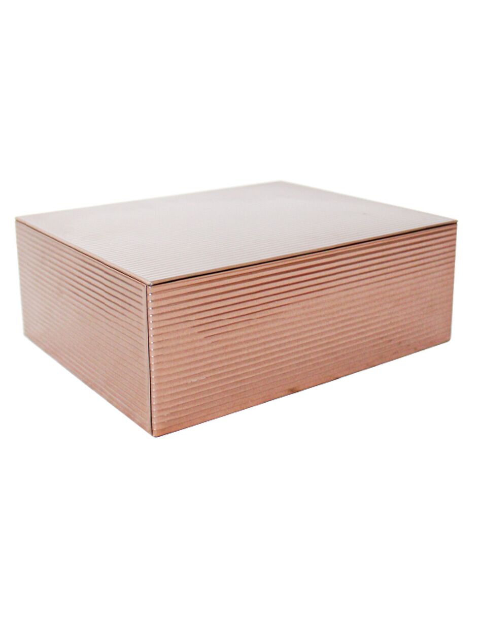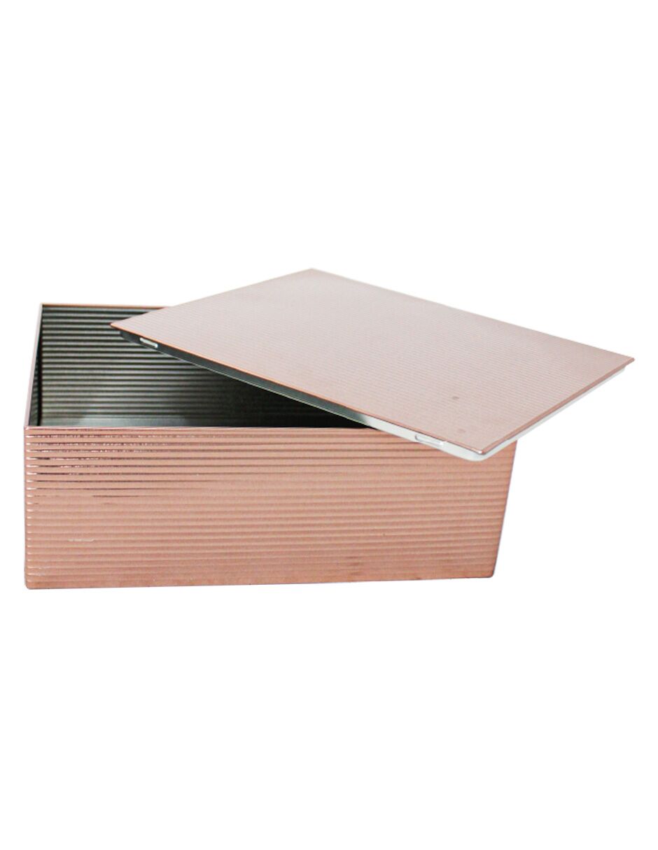 Guarda tus objetos con un toque moderno. Esta caja de lámina rectangular color cobre con diseño de rayas es perfecta para guardar tus pertenencias, añadiendo un acento único y sofisticado. Su diseño te hará sentir el orden y la distinción. Mide 24×19.3×8.8cm.