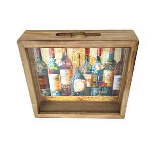 Caja decorativa diseñada específicamente para coleccionar y exhibir corchos de vino. La parte frontal cuenta con un estampado temático de botellas y está fabricada con madera resistente y un panel frontal de vidrio para visualizar la colección. El material es madera y vidrio.
