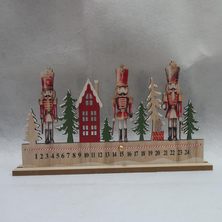 Un festivo calendario de madera con cascanueces y pinos navideños, con medidas de 45x19x4 cm. Ideal para la cuenta regresiva con un toque de fantasía.