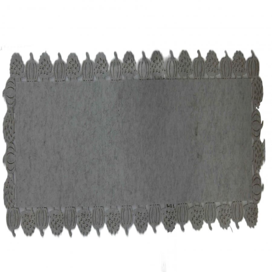 Un elegante camino de mesa de 100x30x0.3cm en color gris neutro, con una orilla perforada con un sutil diseño de calabaza. Fabricado con un material sintético resistente, es ideal para una decoración de mesa sofisticada y discreta en la temporada de Halloween.