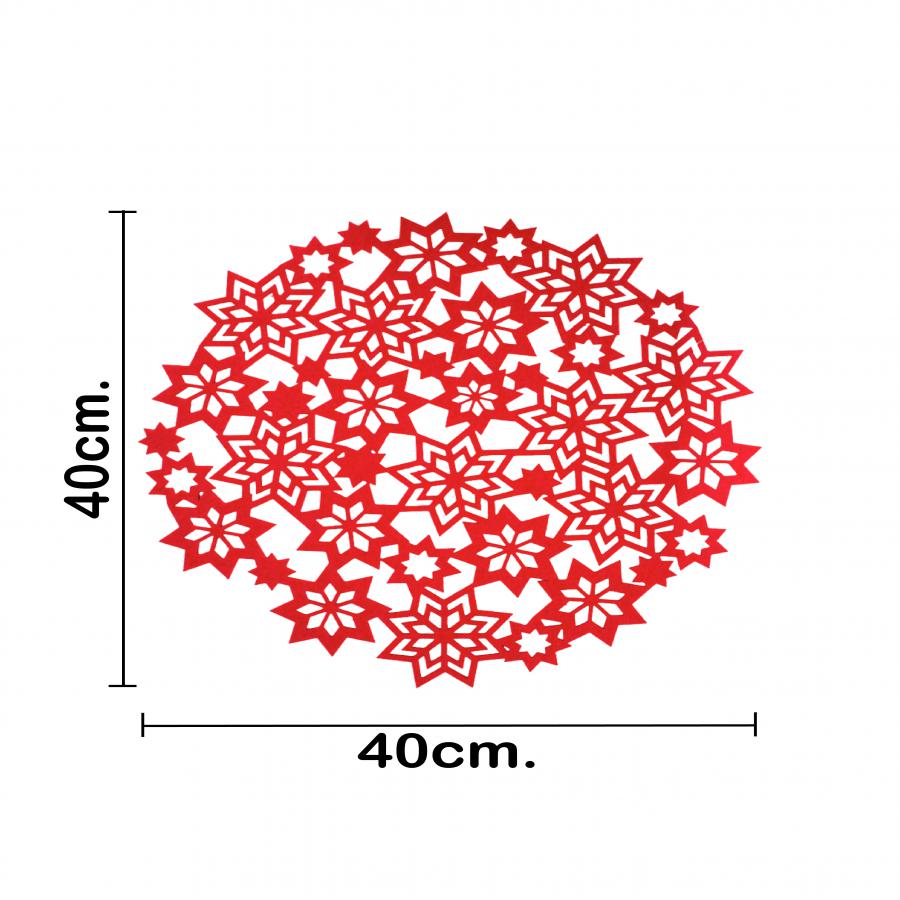 Un festivo camino de mesa de fieltro rojo con un diseño de estrellas, con medidas de 40x40x0.3 cm. Ideal para añadir un toque de color y alegría.