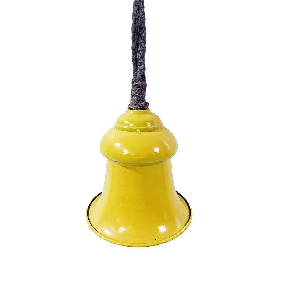Vibrante campana de metal con un acabado amarillo brillante y un adorno de lazo en la parte superior. Medidas: 20 x 23 cm. Su color alegre y energético es perfecto para inyectar vitalidad, luz y alegría a tu decoración.
