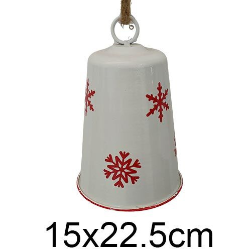 Alegre campana de metal con un acabado blanco y un vibrante estampado de copos de nieve rojos. Medidas: 15 x 22.5 cm. Su diseño evoca la nieve y la fiesta, ideal para inyectar un toque de alegría invernal a tu decoración.