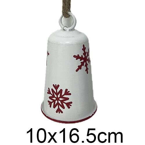 Alegre campana de metal con un acabado blanco y un vibrante estampado de copos de nieve rojos. Medidas: 10 x 16.5 cm. Su diseño evoca la nieve y la fiesta, ideal para inyectar un toque de alegría invernal a tu decoración.
