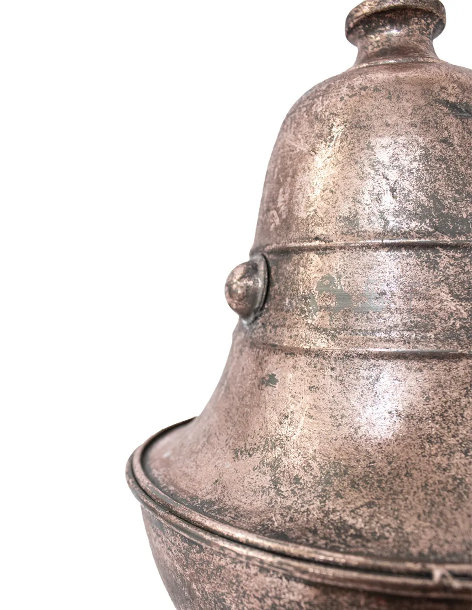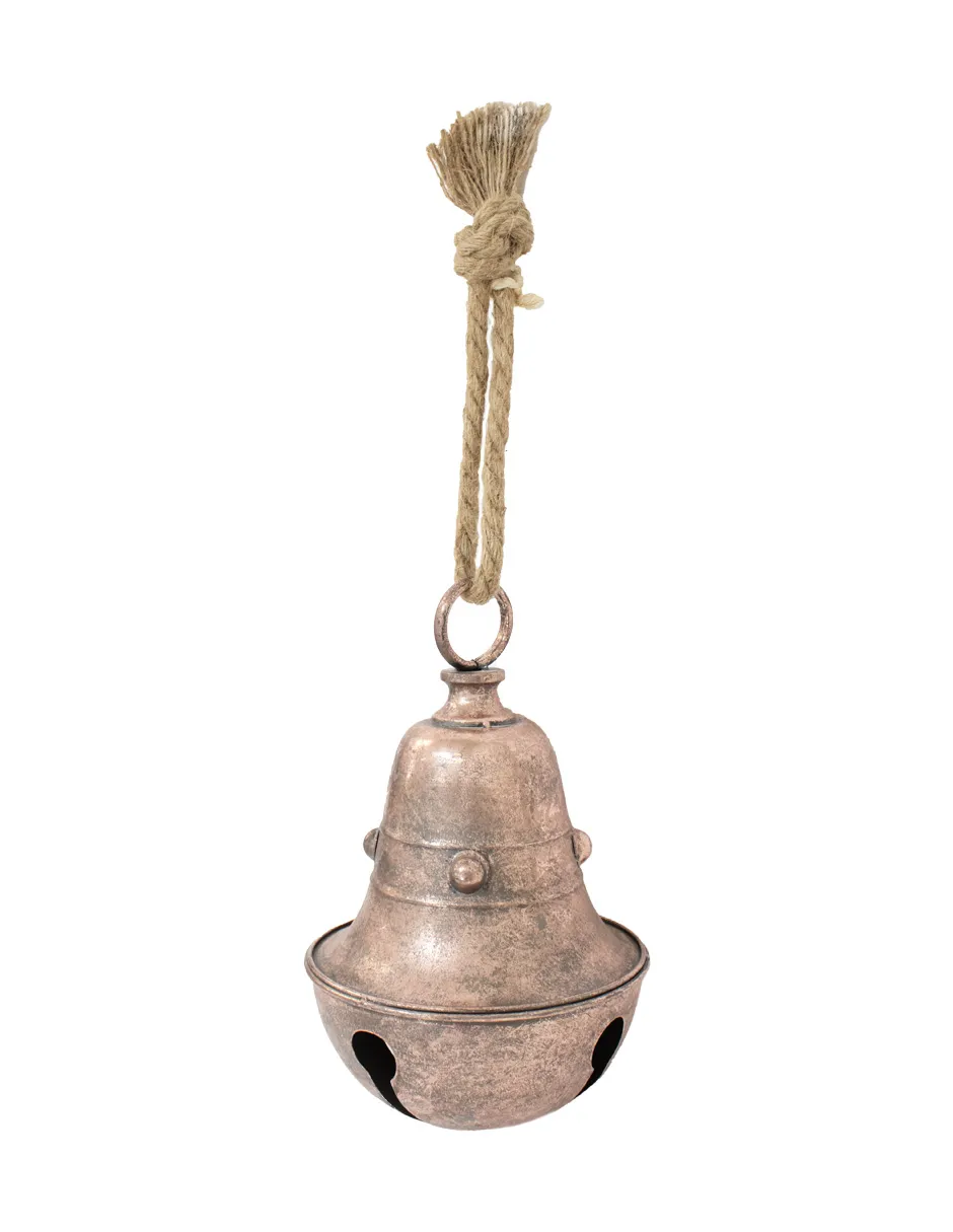 Atractiva campana de metal con un acabado en cobre vintage y un cascabel colgante. Medidas: 16.5 x 29 cm. Su tono cálido y diseño tradicional son ideales para crear un ambiente acogedor y lleno de encanto.