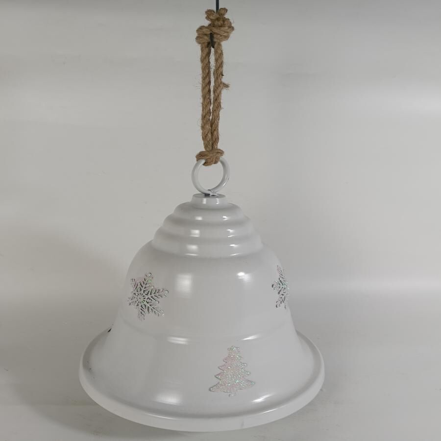 Campana decorativa de metal en color blanco con un elegante grabado navideño. Perfecta para añadir un toque de lujo y tradición a tu decoración. Material: metal. Medidas: 32.5×32.5x40cm.