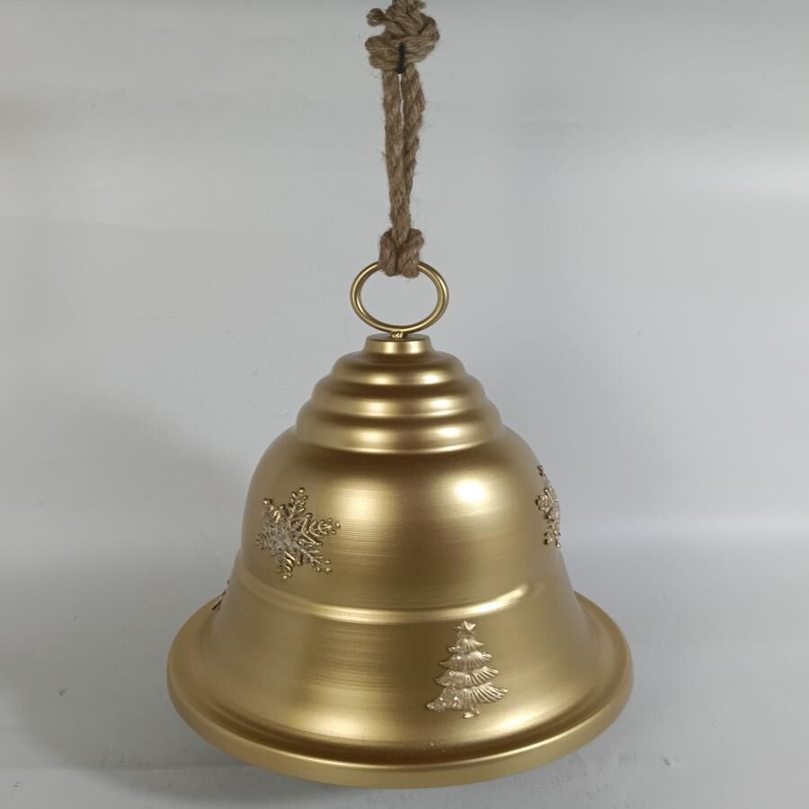 Campana decorativa de metal en color dorado con un elegante grabado navideño. Perfecta para añadir un toque de lujo y tradición a tu decoración. Material: metal. Medidas: 32.5×32.5x40cm.